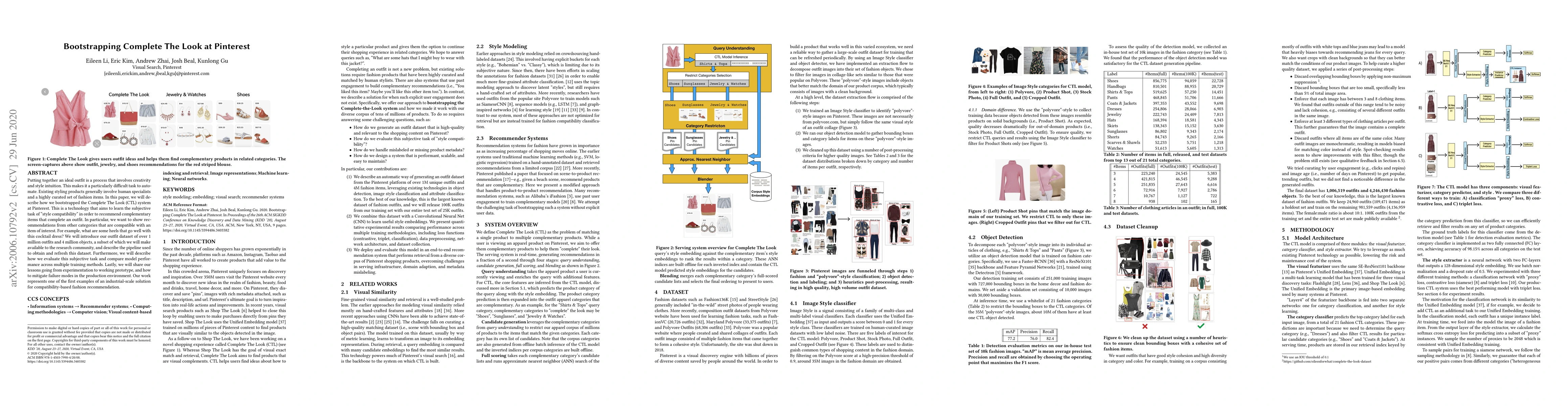 Putting together an ideal outfit is a process that involves creativity and style intuition. This makes it a particularly difficult task to automate. Existing styling products generally involve human specialists and a highly curated set of fashion items. In this paper, we will describe how we bootstrapped the Complete The Look (CTL) system at Pinterest. This is a technology that aims to learn the subjective task of "style compatibility" in order to recommend complementary items that complete an outfit. In particular, we want to show recommendations from other categories that are compatible with an item of interest. For example, what are some heels that go well with this cocktail dress? We will introduce our outfit dataset of over 1 million outfits and 4 million objects, a subset of which we will make available to the research community, and describe the pipeline used to obtain and refresh this dataset. Furthermore, we will describe how we evaluate this subjective task and compare model performance across multiple training methods. Lastly, we will share our lessons going from experimentation to working prototype, and how to mitigate failure modes in the production environment. Our work represents one of the first examples of an industrial-scale solution for compatibility-based fashion recommendation.