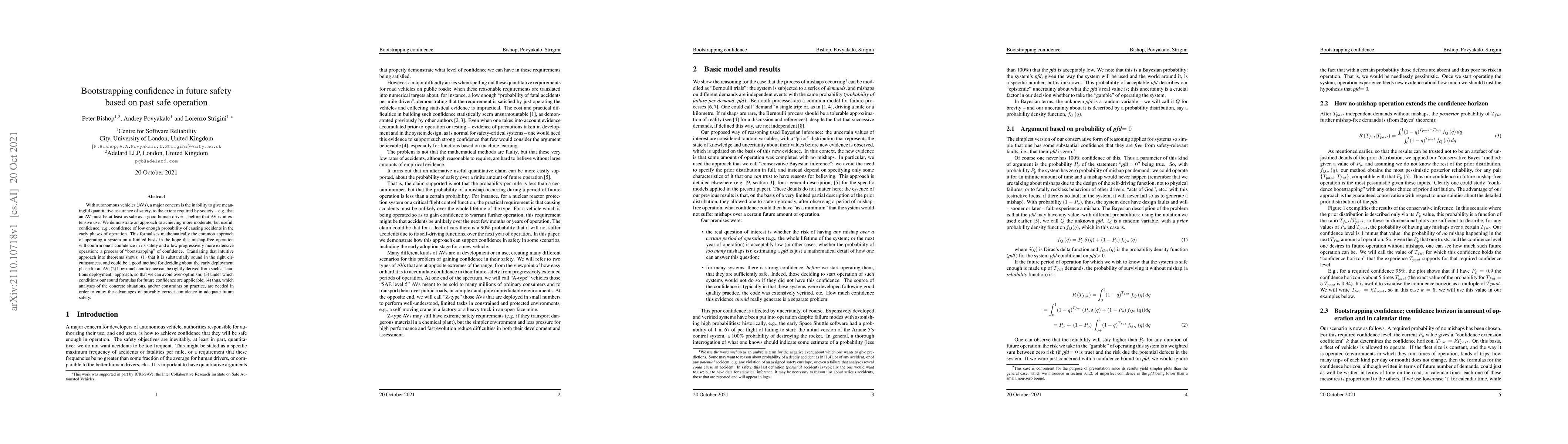 With autonomous vehicles (AVs), a major concern is the inability to give meaningful quantitative assurance of safety, to the extent required by society - e.g. that an AV must be at least as safe as a good human driver - before that AV is in extensive use. We demonstrate an approach to achieving more moderate, but useful, confidence, e.g., confidence of low enough probability of causing accidents in the early phases of operation. This formalises mathematically the common approach of operating a system on a limited basis in the hope that mishap-free operation will confirm one's confidence in its safety and allow progressively more extensive operation: a process of "bootstrapping" of confidence. Translating that intuitive approach into theorems shows: (1) that it is substantially sound in the right circumstances, and could be a good method for deciding about the early deployment phase for an AV; (2) how much confidence can be rightly derived from such a "cautious deployment" approach, so that we can avoid over-optimism; (3) under which conditions our sound formulas for future confidence are applicable; (4) thus, which analyses of the concrete situations, and/or constraints on practice, are needed in order to enjoy the advantages of provably correct confidence in adequate future safety.