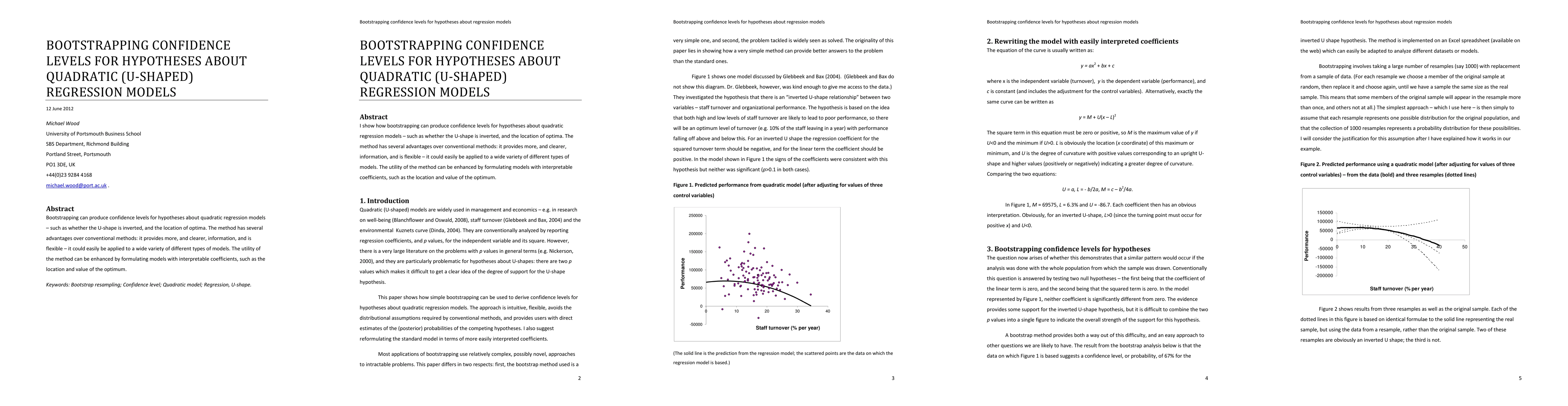 Bootstrapping can produce confidence levels for hypotheses about quadratic regression models - such as whether the U-shape is inverted, and the location of optima. The method has several advantages over conventional methods: it provides more, and clearer, information, and is flexible - it could easily be applied to a wide variety of different types of models. The utility of the method can be enhanced by formulating models with interpretable coefficients, such as the location and value of the optimum. Keywords: Bootstrap resampling; Confidence level; Quadratic model; Regression, U-shape.