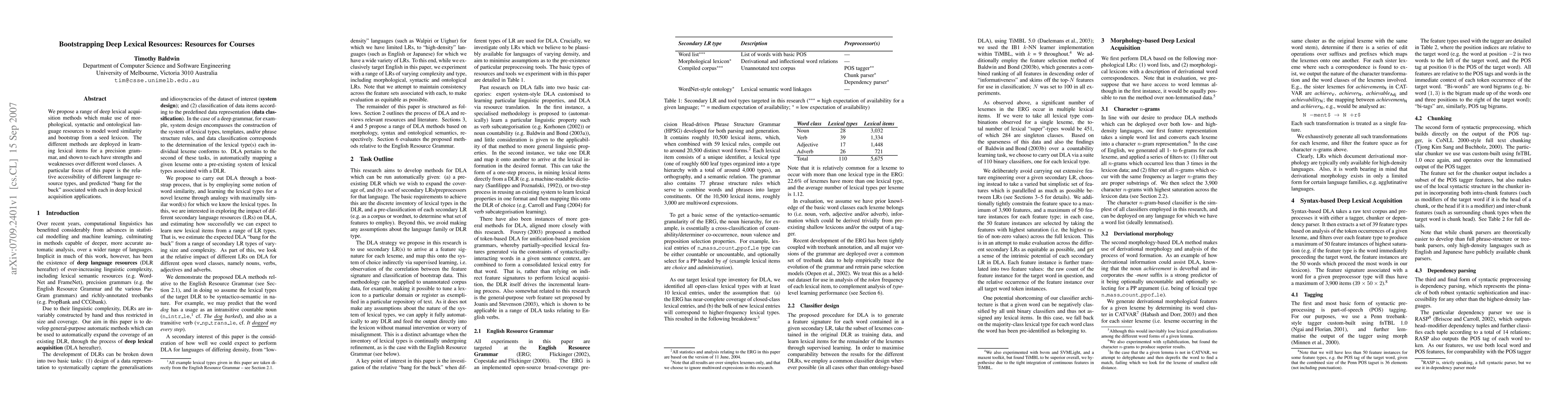 This paper introduces deep lexical acquisition methods utilizing morphological, syntactic, and ontological resources to model word similarity and bootstrap from an initial lexicon. It evaluates various methods in learning lexical items for a precision grammar, highlighting their strengths and weaknesses across different word classes and the accessibility of different language resources.