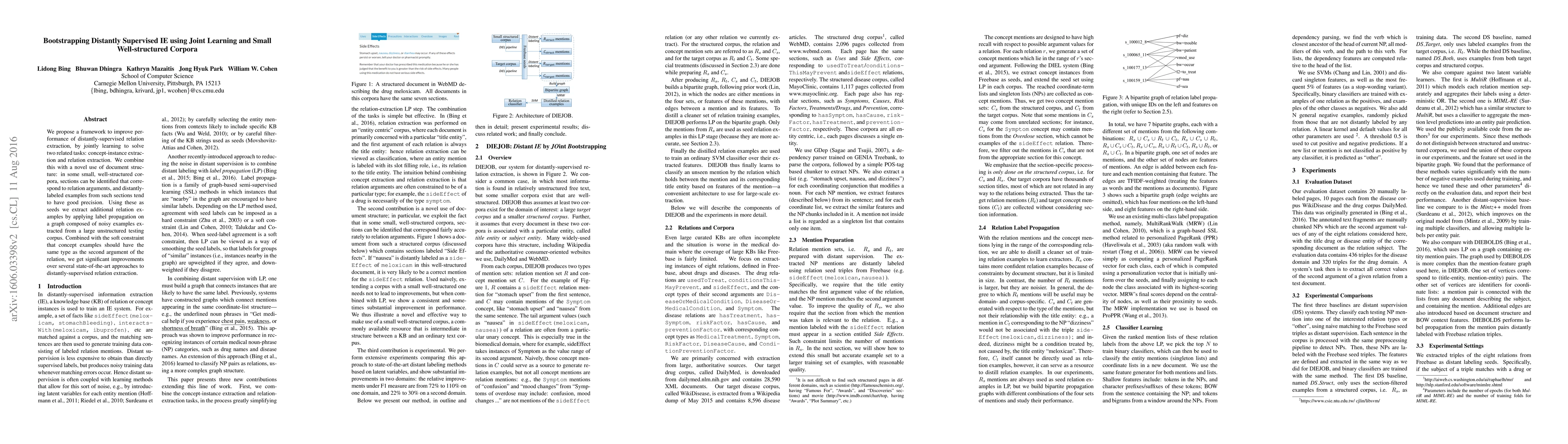 The paper proposes a framework that enhances distantly-supervised relation extraction by jointly learning concept-instance extraction and relation extraction, leveraging small, well-structured corpora with identifiable sections that correspond to relation arguments to improve precision. The method significantly outperforms state-of-the-art approaches by propagating labels on a graph of noisy examples from a large unstructured corpus.