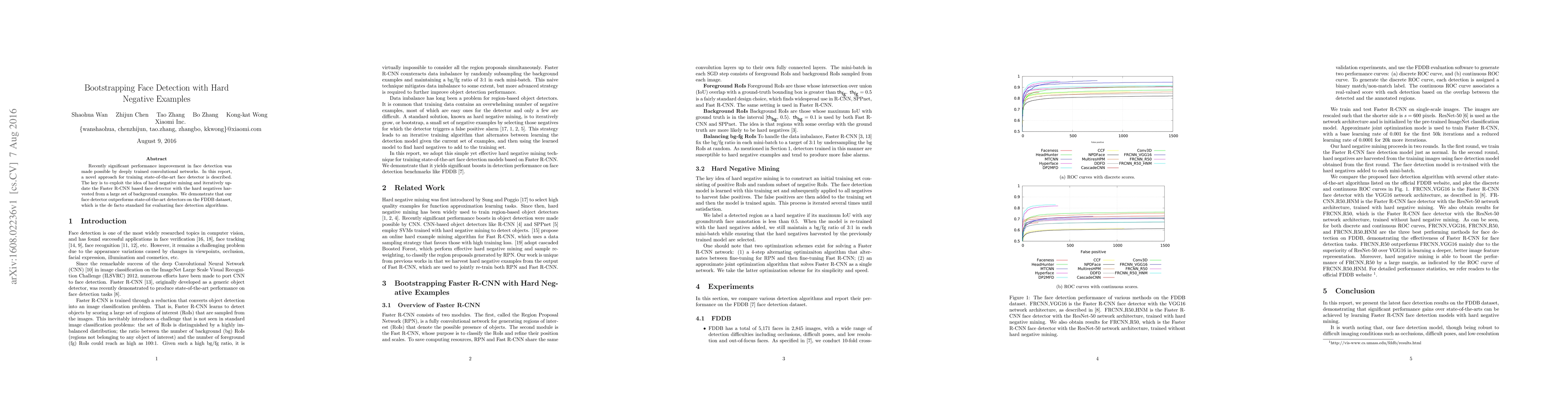 Recently significant performance improvement in face detection was made possible by deeply trained convolutional networks. In this report, a novel approach for training state-of-the-art face detector is described. The key is to exploit the idea of hard negative mining and iteratively update the Faster R-CNN based face detector with the hard negatives harvested from a large set of background examples. We demonstrate that our face detector outperforms state-of-the-art detectors on the FDDB dataset, which is the de facto standard for evaluating face detection algorithms.