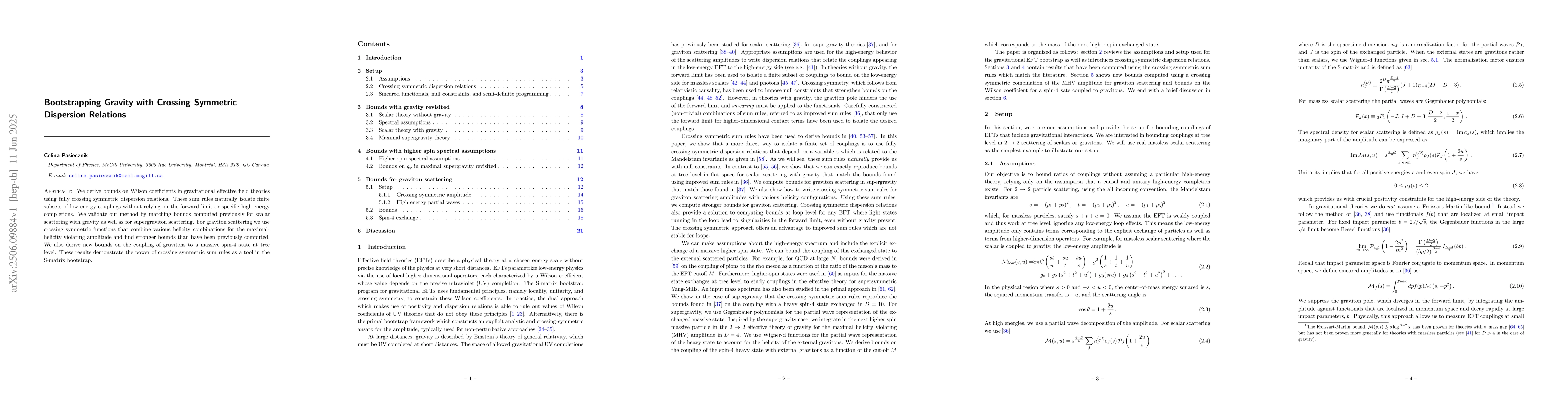 We derive bounds on Wilson coefficients in gravitational effective field theories using fully crossing symmetric dispersion relations. These sum rules naturally isolate finite subsets of low-energy couplings without relying on the forward limit or specific high-energy completions. We validate our method by matching bounds computed previously for scalar scattering with gravity as well as for supergraviton scattering. For graviton scattering we use crossing symmetric functions that combine various helicity combinations for the maximal-helicity violating amplitude and find stronger bounds than have been previously computed. We also derive new bounds on the coupling of gravitons to a massive spin-4 state at tree level. These results demonstrate the power of crossing symmetric sum rules as a tool in the S-matrix bootstrap.