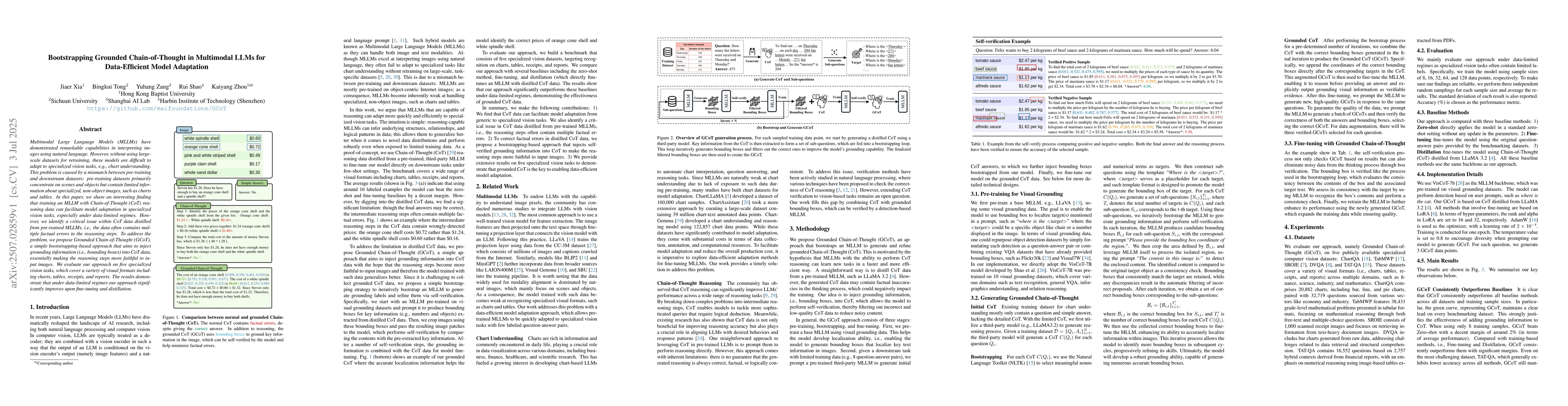 This paper introduces Grounded Chain-of-Thought (GCoT), a method to improve Multimodal Large Language Models' (MLLMs) adaptation to specialized vision tasks with limited data. GCoT corrects factual errors in Chain-of-Thought (CoT) reasoning data by incorporating image grounding information (bounding boxes), significantly enhancing performance on tasks like chart understanding, tables, receipts, and reports.