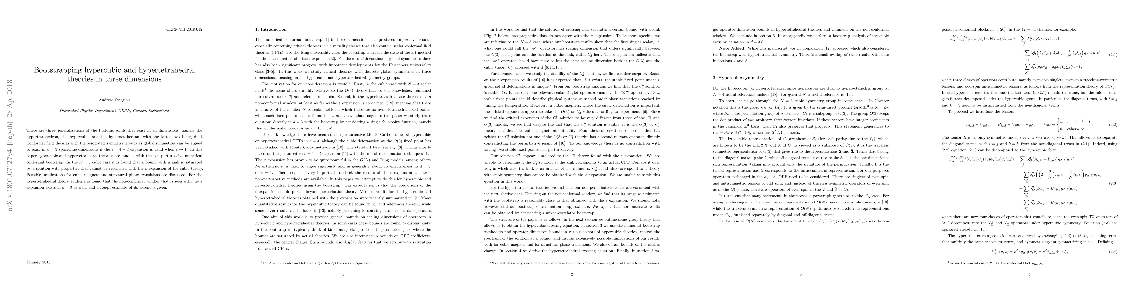 There are three generalizations of the Platonic solids that exist in all dimensions, namely the hypertetrahedron, the hypercube, and the hyperoctahedron, with the latter two being dual. Conformal field theories with the associated symmetry groups as global symmetries can be argued to exist in $d=3$ spacetime dimensions if the $\varepsilon=4-d$ expansion is valid when $\varepsilon\to1$. In this paper hypercubic and hypertetrahedral theories are studied with the non-perturbative numerical conformal bootstrap. In the $N=3$ cubic case it is found that a bound with a kink is saturated by a solution with properties that cannot be reconciled with the $\varepsilon$ expansion of the cubic theory. Possible implications for cubic magnets and structural phase transitions are discussed. For the hypertetrahedral theory evidence is found that the non-conformal window that is seen with the $\varepsilon$ expansion exists in $d=3$ as well, and a rough estimate of its extent is given.