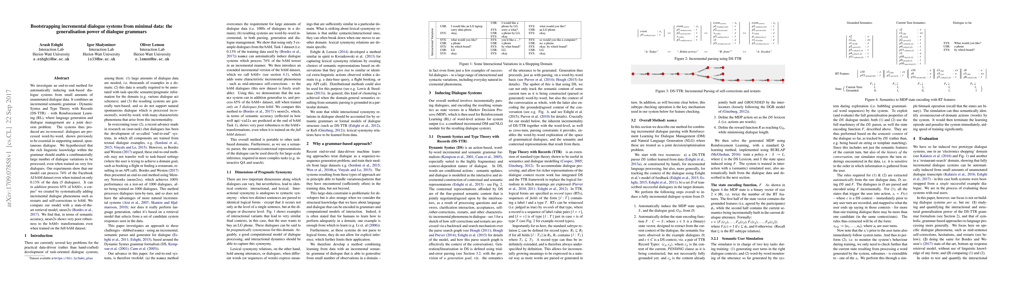 This paper proposes an end-to-end method for inducing task-based dialogue systems from minimal unannotated data using an incremental semantic grammar combined with Reinforcement Learning. The model demonstrates strong generalization, processing 74% of the bAbI dataset trained on just 0.13% of it, and 65% of the bAbI+ dataset, showing robustness to incremental dialogue phenomena.