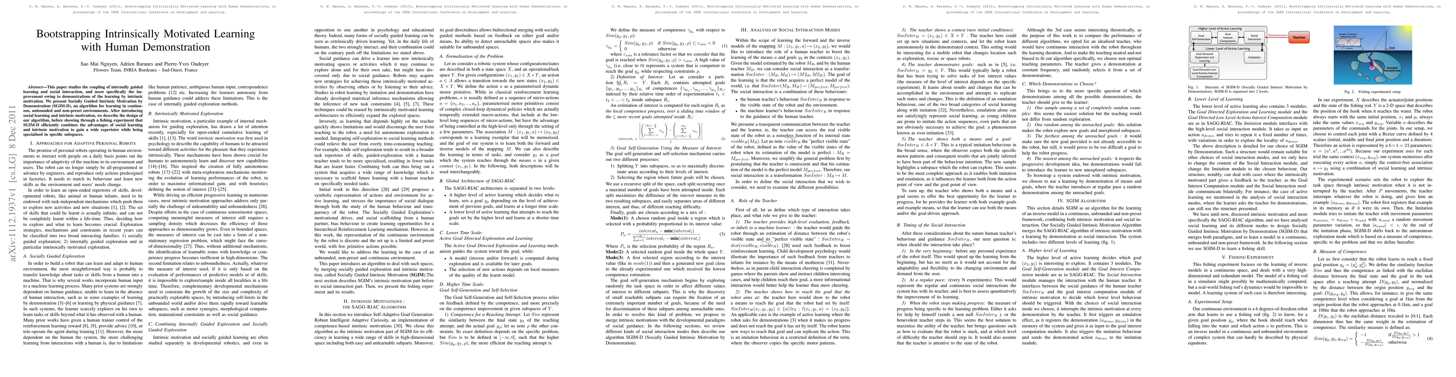 This paper studies the coupling of internally guided learning and social interaction, and more specifically the improvement owing to demonstrations of the learning by intrinsic motivation. We present Socially Guided Intrinsic Motivation by Demonstration (SGIM-D), an algorithm for learning in continuous, unbounded and non-preset environments. After introducing social learning and intrinsic motivation, we describe the design of our algorithm, before showing through a fishing experiment that SGIM-D efficiently combines the advantages of social learning and intrinsic motivation to gain a wide repertoire while being specialised in specific subspaces.