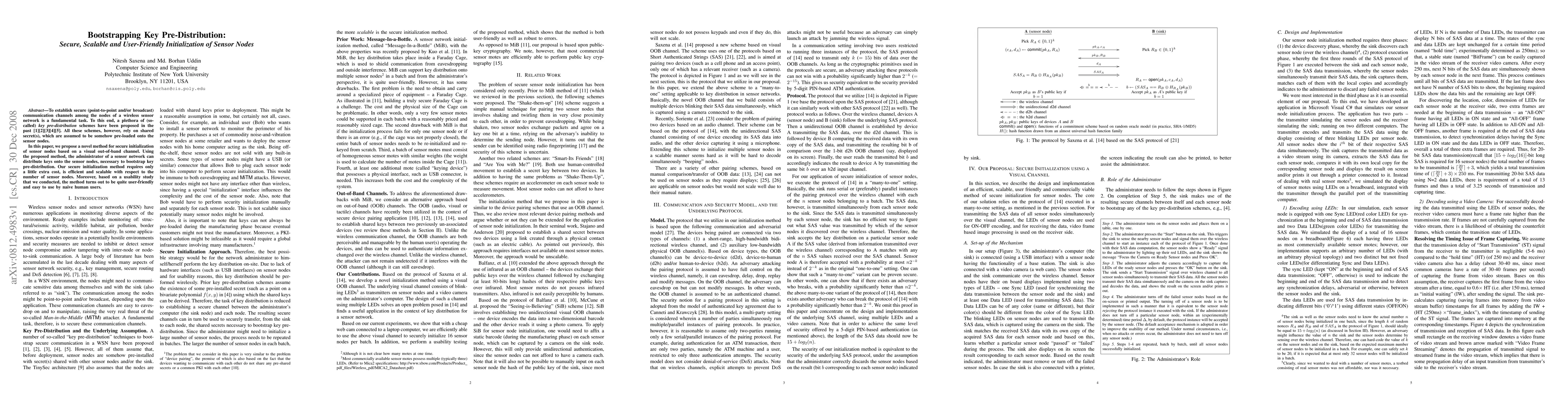 This paper proposes a novel method for secure initialization of sensor nodes using a visual out-of-band channel, enabling key pre-distribution without relying on pre-loaded shared secrets. The method is efficient, scalable, and user-friendly, as demonstrated by a conducted usability study.