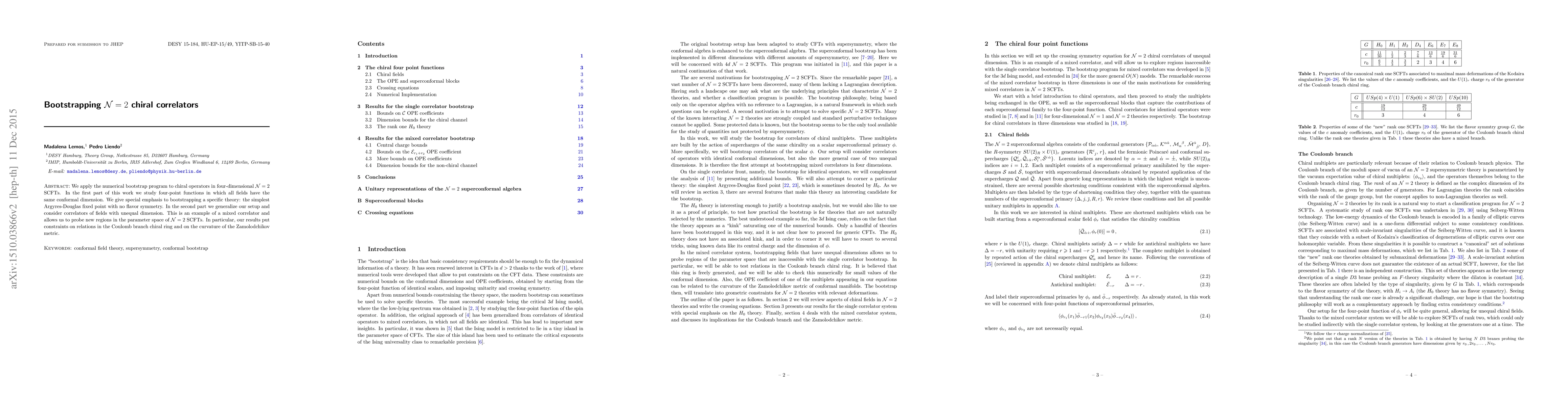 This paper uses the numerical bootstrap method to analyze four-point correlators in four-dimensional ${\mathcal N}=2$ SCFTs, focusing on chiral operators with equal and unequal conformal dimensions. It highlights findings for the simplest Argyres-Douglas fixed point and provides new constraints on the Coulomb branch chiral ring and the Zamolodchikov metric curvature.