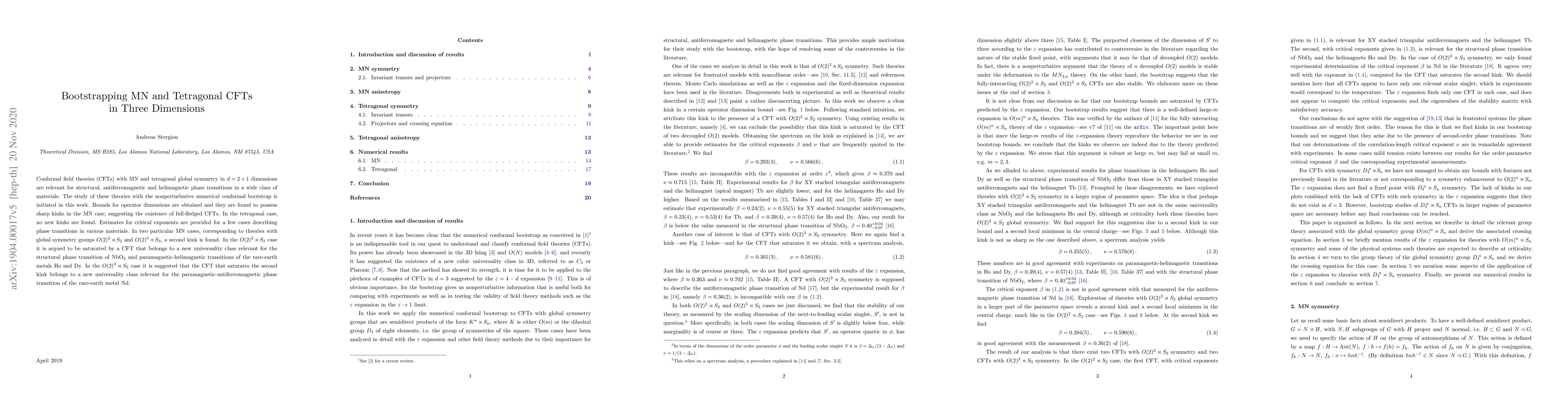 This paper initiates the study of conformal field theories (CFTs) with MN and tetragonal symmetries in three dimensions using the nonperturbative numerical conformal bootstrap. It finds sharp kinks in operator dimensions for MN CFTs, suggesting their existence, and provides estimates for critical exponents relevant to various material phase transitions.