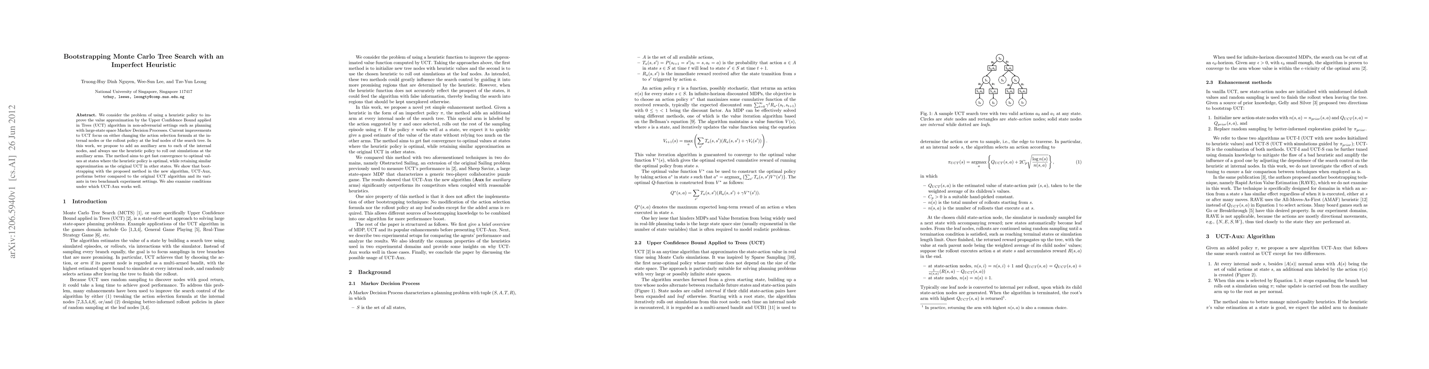 This paper proposes UCT-Aux, a variant of Monte Carlo Tree Search that incorporates an auxiliary arm at each internal node to use an imperfect heuristic policy for faster convergence in optimal states. The method shows improved performance over the original UCT algorithm in benchmark experiments, while retaining similar approximation quality in other states.