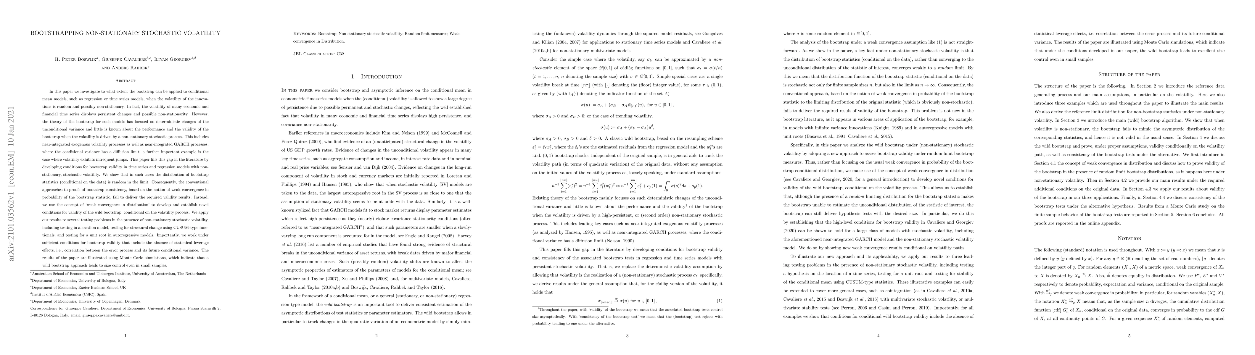 This paper develops conditions for the bootstrap's validity in time series regressions with non-stationary, stochastic volatility, using "weak convergence in distribution" instead of conventional methods. It shows that the wild bootstrap can control size even in small samples, provided there are no leverage effects.