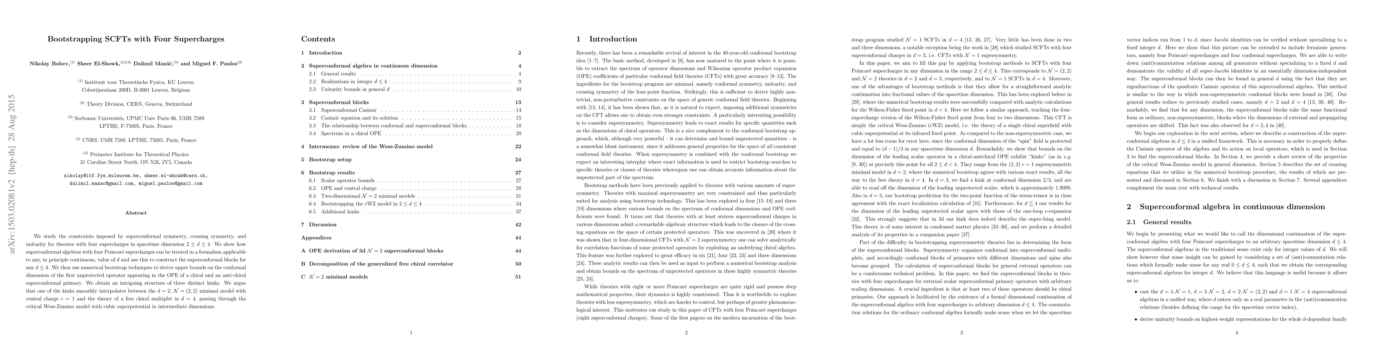 We study the constraints imposed by superconformal symmetry, crossing symmetry, and unitarity for theories with four supercharges in spacetime dimension $2\leq d\leq 4$. We show how superconformal algebras with four Poincar\'{e} supercharges can be treated in a formalism applicable to any, in principle continuous, value of $d$ and use this to construct the superconformal blocks for any $d\leq 4$. We then use numerical bootstrap techniques to derive upper bounds on the conformal dimension of the first unprotected operator appearing in the OPE of a chiral and an anti-chiral superconformal primary. We obtain an intriguing structure of three distinct kinks. We argue that one of the kinks smoothly interpolates between the $d=2$, $\mathcal N=(2,2)$ minimal model with central charge $c=1$ and the theory of a free chiral multiplet in $d=4$, passing through the critical Wess-Zumino model with cubic superpotential in intermediate dimensions.