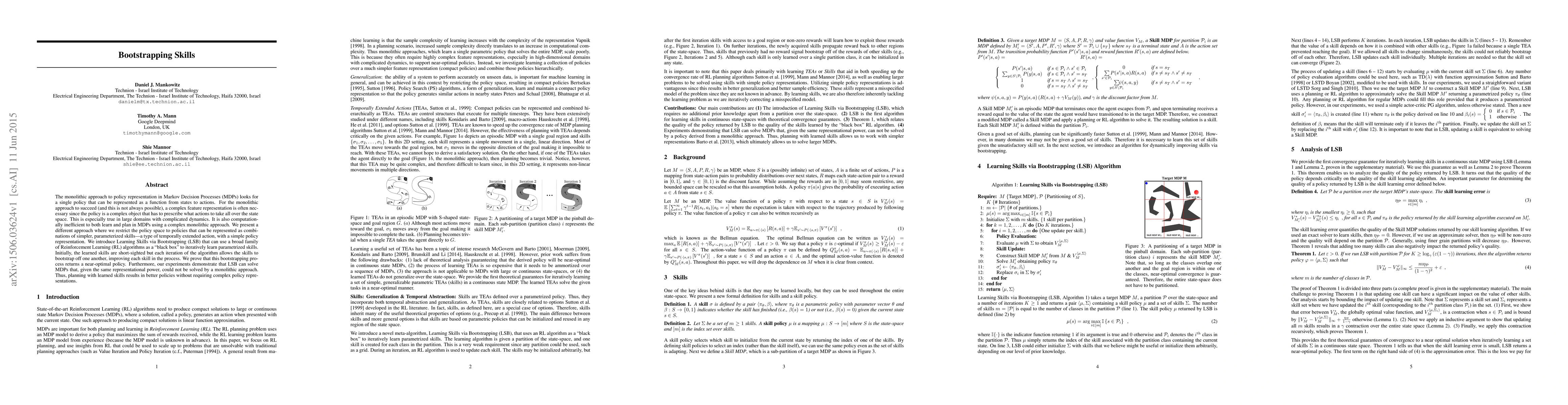 This research introduces Learning Skills via Bootstrapping (LSB), a method that breaks down complex policy representation in Markov Decision Processes (MDPs) into simpler, parameterized skills. LSB uses various Reinforcement Learning (RL) algorithms to iteratively learn these skills, improving each through a bootstrapping process. The method is proven to return near-optimal policies and has been shown to solve MDPs that monolithic approaches couldn't, demonstrating better policy generation without complex representations.