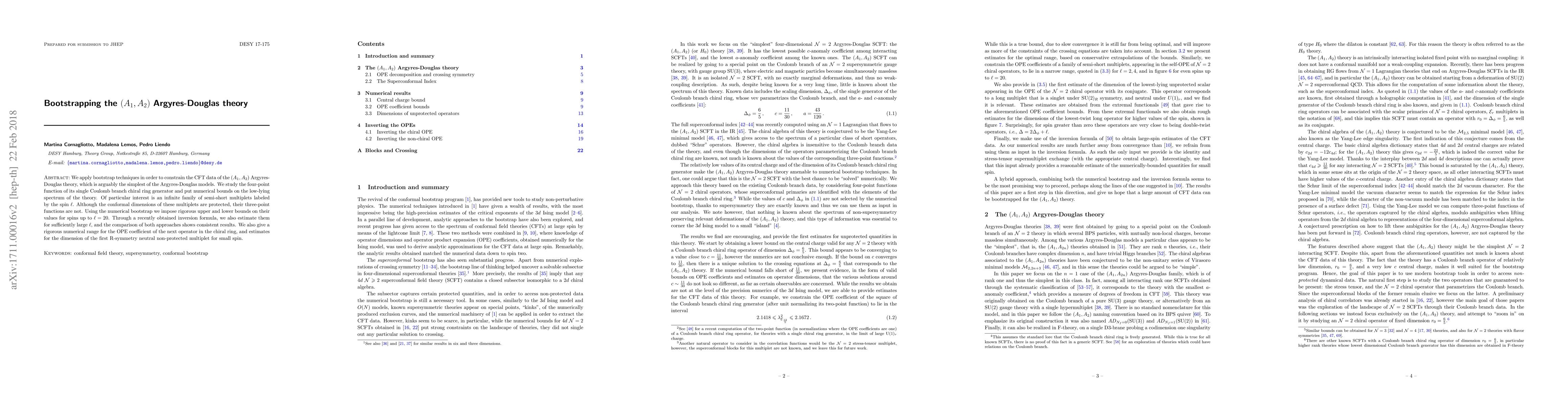 We apply bootstrap techniques in order to constrain the CFT data of the $(A_1,A_2)$ Argyres-Douglas theory, which is arguably the simplest of the Argyres-Douglas models. We study the four-point function of its single Coulomb branch chiral ring generator and put numerical bounds on the low-lying spectrum of the theory. Of particular interest is an infinite family of semi-short multiplets labeled by the spin $\ell$. Although the conformal dimensions of these multiplets are protected, their three-point functions are not. Using the numerical bootstrap we impose rigorous upper and lower bounds on their values for spins up to $\ell=20$. Through a recently obtained inversion formula, we also estimate them for sufficiently large $\ell$, and the comparison of both approaches shows consistent results. We also give a rigorous numerical range for the OPE coefficient of the next operator in the chiral ring, and estimates for the dimension of the first R-symmetry neutral non-protected multiplet for small spin.