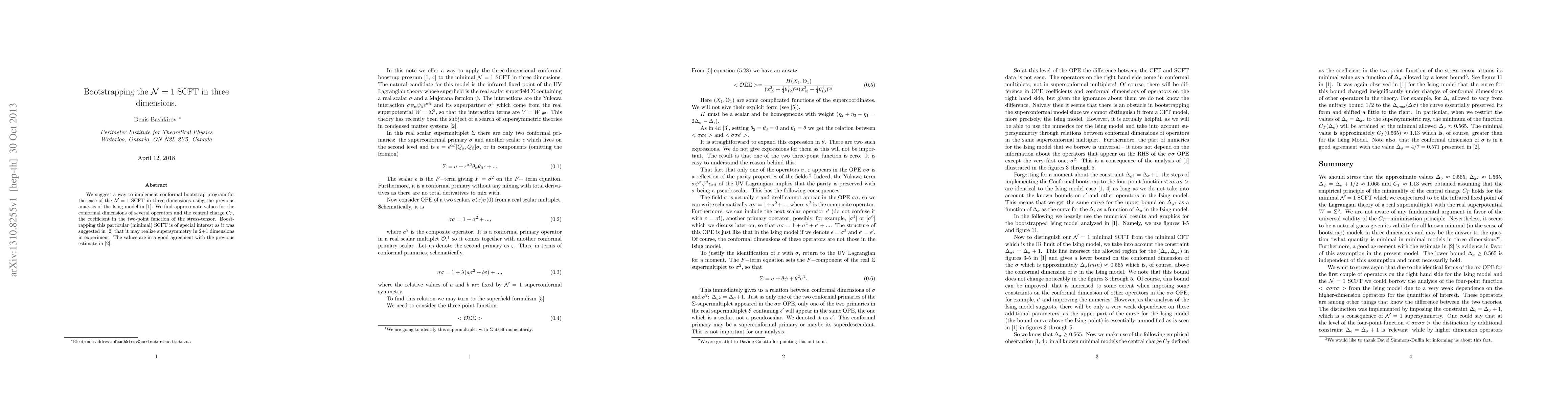 This paper proposes a method to apply the conformal bootstrap program to $\mathcal{N}=1$ supersymmetric conformal field theories (SCFT) in three dimensions, deriving approximate values for key parameters like conformal dimensions and the central charge $C_T$. The results align well with previous estimates, suggesting potential experimental realization of supersymmetry in 2+1 dimensions.