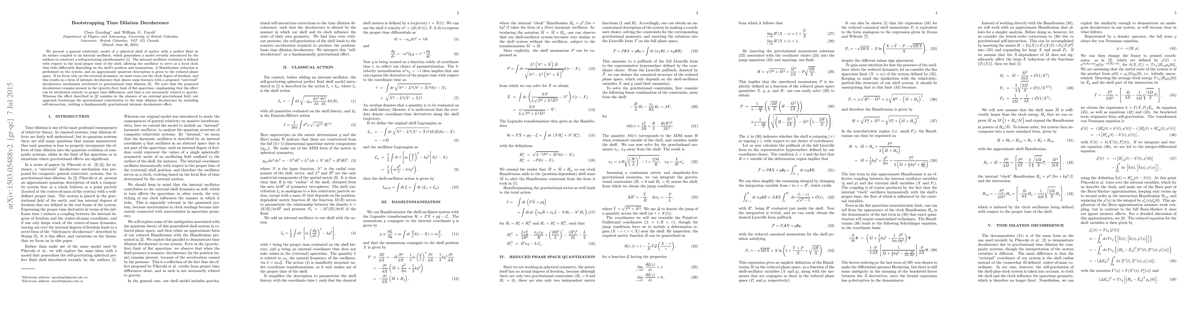 We present a general relativistic model of a spherical shell of matter with a perfect fluid on its surface coupled to an internal oscillator, which generalizes a model recently introduced by the authors to construct a self-gravitating interferometer [1]. The internal oscillator evolution is defined with respect to the local proper time of the shell, allowing the oscillator to serve as a local clock that ticks differently depending on the shell's position and momentum. A Hamiltonian reduction is performed on the system, and an approximate quantum description is given to the reduced phase space. If we focus only on the external dynamics, we must trace out the clock degree of freedom, and this results in a form of intrinsic decoherence that shares some features with a proposed "universal" decoherence mechanism attributed to gravitational time dilation [2]. We note that the proposed decoherence remains present in the (gravity-free) limit of flat spacetime, emphasizing that the effect can be attributed entirely to proper time differences, and thus is not necessarily related to gravity. Whereas the effect described in [2] vanishes in the absence of an external gravitational field, our approach bootstraps the gravitational contribution to the time dilation decoherence by including self-interaction, yielding a fundamentally gravitational intrinsic decoherence effect.