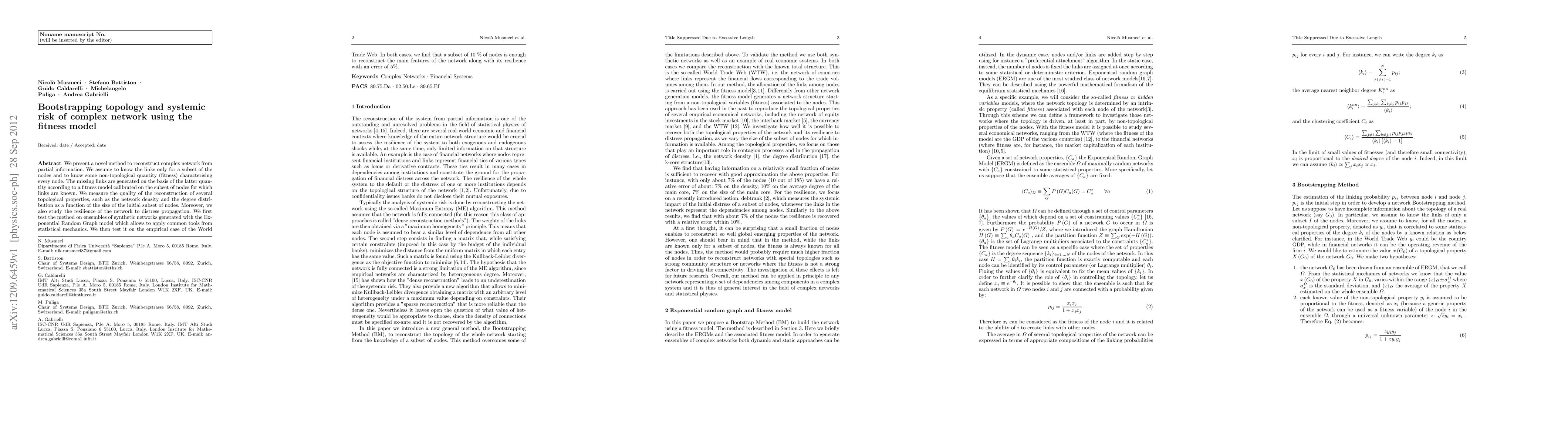 We present a novel method to reconstruct complex network from partial information. We assume to know the links only for a subset of the nodes and to know some non-topological quantity (fitness) characterising every node. The missing links are generated on the basis of the latter quan- tity according to a fitness model calibrated on the subset of nodes for which links are known. We measure the quality of the reconstruction of several topological properties, such as the network density and the degree distri- bution as a function of the size of the initial subset of nodes. Moreover, we also study the resilience of the network to distress propagation. We first test the method on ensembles of synthetic networks generated with the Exponential Random Graph model which allows to apply common tools from statistical mechanics. We then test it on the empirical case of the World Trade Web. In both cases, we find that a subset of 10 % of nodes is enough to reconstruct the main features of the network along with its resilience with an error of 5%.