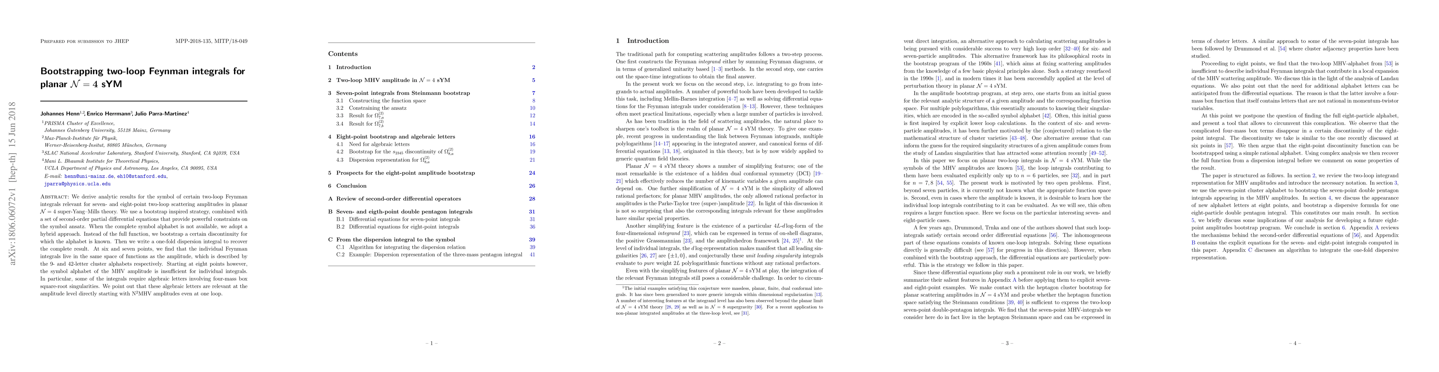 This paper derives analytic results for two-loop Feynman integrals in planar $\mathcal{N}=4$ super-Yang-Mills theory using a bootstrap strategy and second-order PDEs. It finds that at six and seven points, integrals share the same function space as the amplitude, but at eight points, additional algebraic terms are needed, relevant even at the amplitude level starting from N$^2$MHV one-loop.
