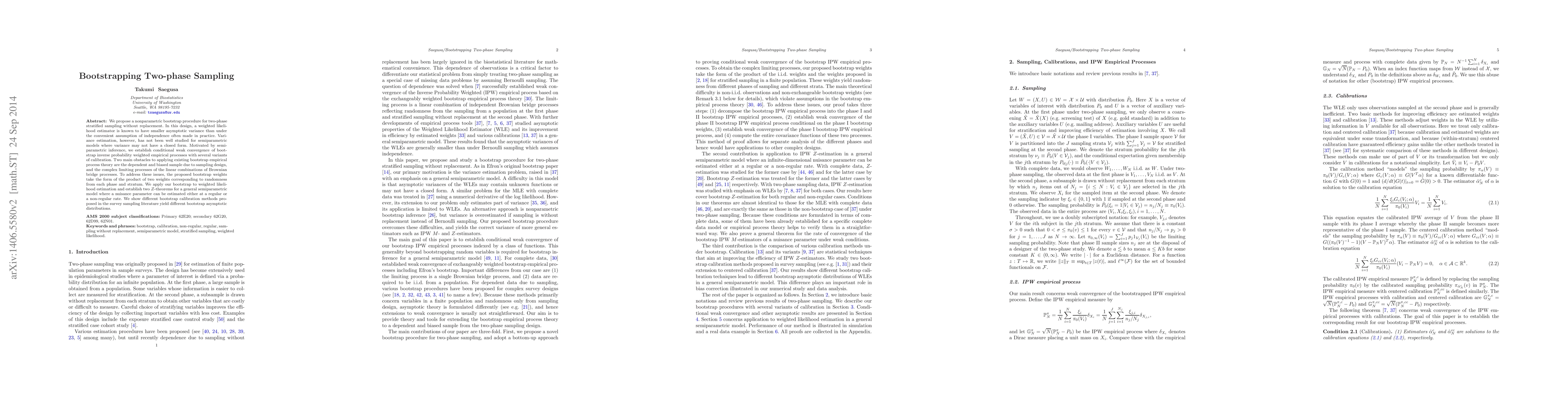 This paper proposes a nonparametric bootstrap method for two-phase stratified sampling without replacement, addressing the challenge of variance estimation in semiparametric models. The authors establish conditional weak convergence of bootstrap inverse probability weighted empirical processes, overcoming issues of dependence and bias in the sampling design.