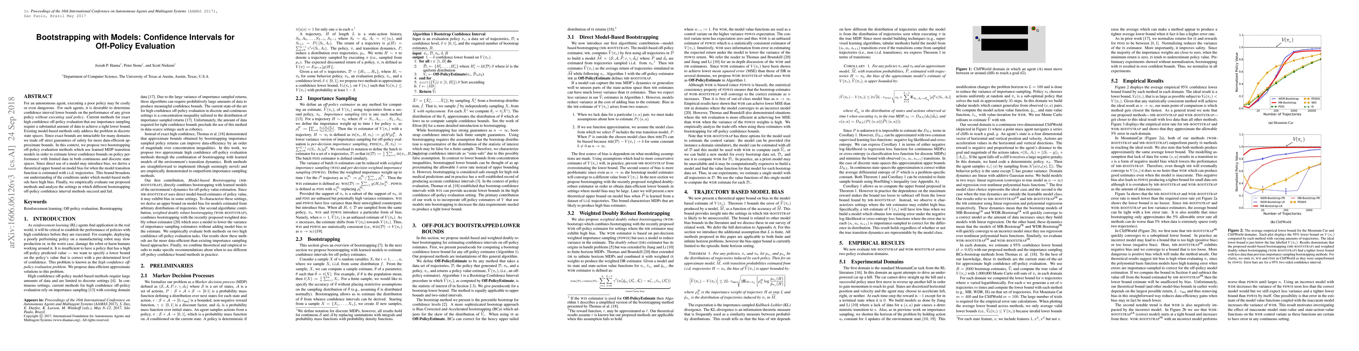 For an autonomous agent, executing a poor policy may be costly or even dangerous. For such agents, it is desirable to determine confidence interval lower bounds on the performance of any given policy without executing said policy. Current methods for exact high confidence off-policy evaluation that use importance sampling require a substantial amount of data to achieve a tight lower bound. Existing model-based methods only address the problem in discrete state spaces. Since exact bounds are intractable for many domains we trade off strict guarantees of safety for more data-efficient approximate bounds. In this context, we propose two bootstrapping off-policy evaluation methods which use learned MDP transition models in order to estimate lower confidence bounds on policy performance with limited data in both continuous and discrete state spaces. Since direct use of a model may introduce bias, we derive a theoretical upper bound on model bias for when the model transition function is estimated with i.i.d. trajectories. This bound broadens our understanding of the conditions under which model-based methods have high bias. Finally, we empirically evaluate our proposed methods and analyze the settings in which different bootstrapping off-policy confidence interval methods succeed and fail.