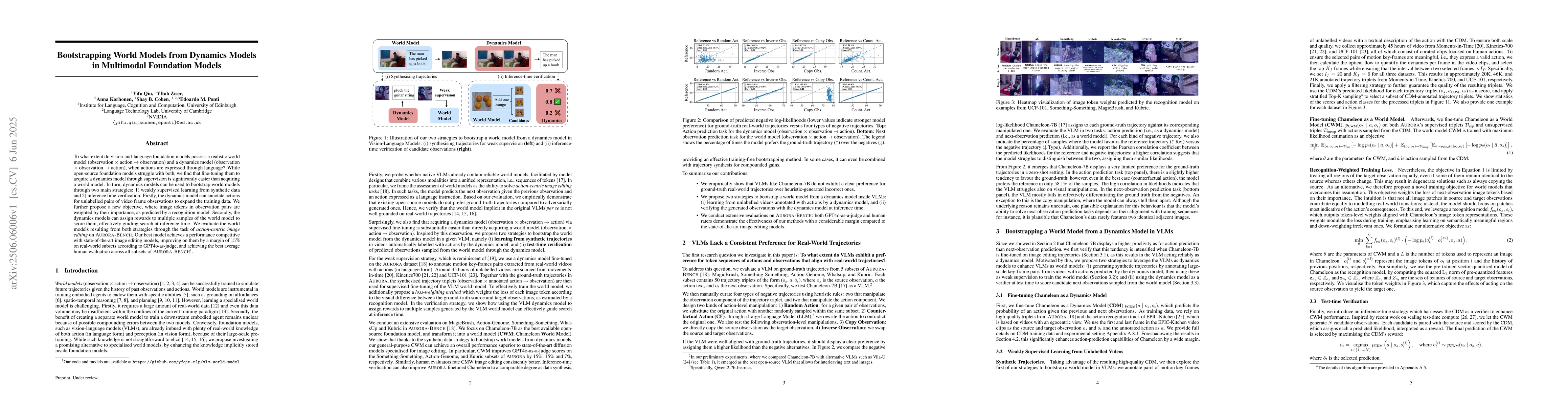 To what extent do vision-and-language foundation models possess a realistic world model (observation $\times$ action $\rightarrow$ observation) and a dynamics model (observation $\times$ observation $\rightarrow$ action), when actions are expressed through language? While open-source foundation models struggle with both, we find that fine-tuning them to acquire a dynamics model through supervision is significantly easier than acquiring a world model. In turn, dynamics models can be used to bootstrap world models through two main strategies: 1) weakly supervised learning from synthetic data and 2) inference time verification. Firstly, the dynamics model can annotate actions for unlabelled pairs of video frame observations to expand the training data. We further propose a new objective, where image tokens in observation pairs are weighted by their importance, as predicted by a recognition model. Secondly, the dynamics models can assign rewards to multiple samples of the world model to score them, effectively guiding search at inference time. We evaluate the world models resulting from both strategies through the task of action-centric image editing on Aurora-Bench. Our best model achieves a performance competitive with state-of-the-art image editing models, improving on them by a margin of $15\%$ on real-world subsets according to GPT4o-as-judge, and achieving the best average human evaluation across all subsets of Aurora-Bench.