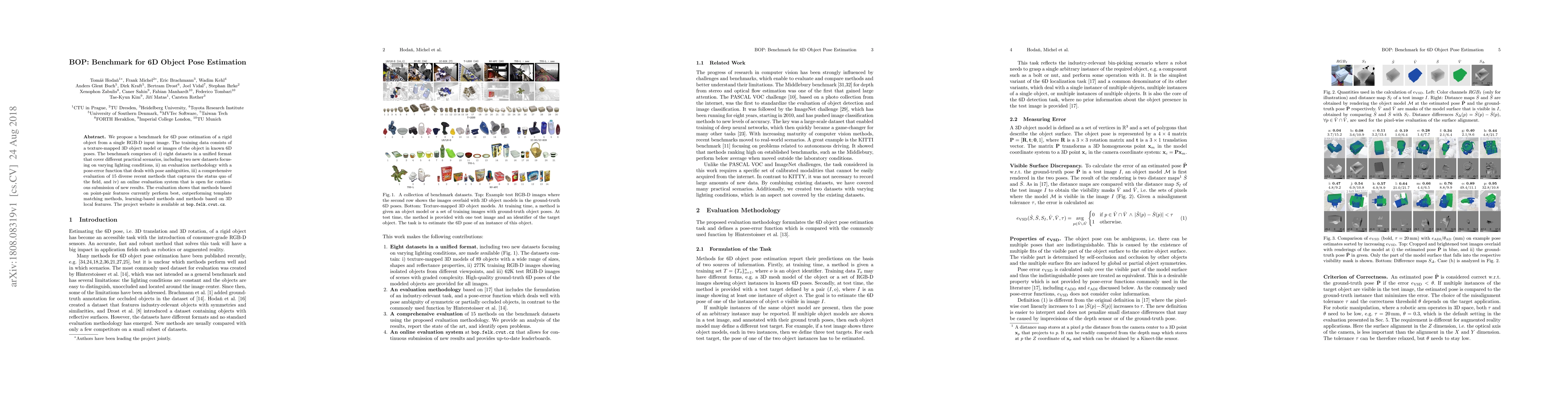 This paper introduces a benchmark for 6D object pose estimation using RGB-D images, featuring eight datasets, an evaluation methodology, and an online submission system. The study finds that point-pair feature-based methods currently outperform others in the field.