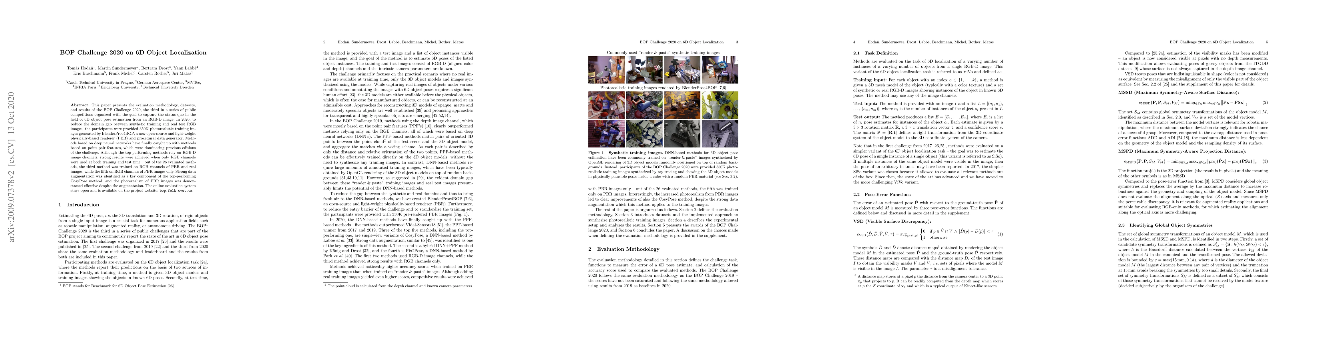 Researchers evaluated 6D object localization methods in the BOP Challenge 2020, finding that deep neural networks have surpassed point pair feature-based methods, with strong results achieved using RGB channels alone or with data augmentation.