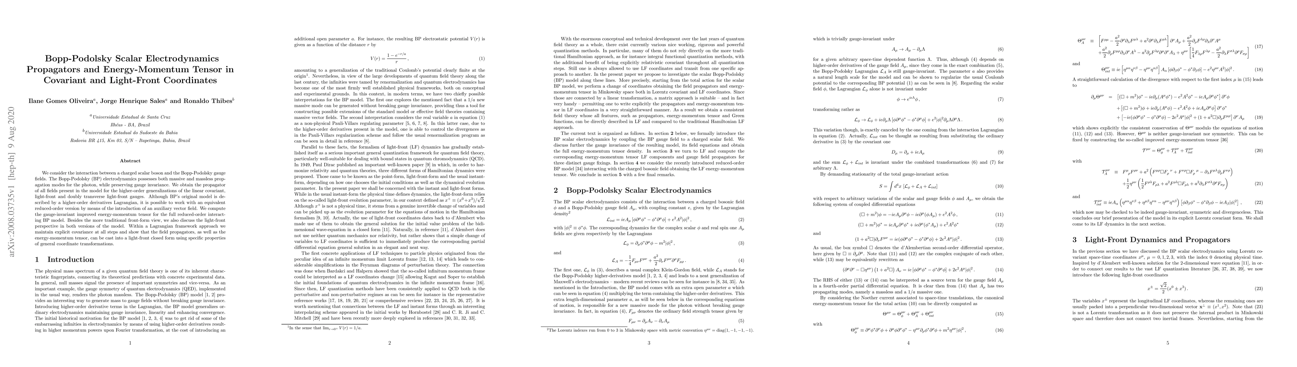 We consider the interaction between a charged scalar boson and the Bopp-Podolsky gauge fields. The Bopp-Podolsky (BP) electrodynamics possesses both massive and massless propagation modes for the photon, while preserving gauge invariance. We obtain the propagator of all fields present in the model for the higher-order generalizations of the linear covariant, light-front and doubly transverse light-front gauges. Although BP's original model is described by a higher-order derivatives Lagrangian, it is possible to work with an equivalent reduced-order version by means of the introduction of an auxiliary vector field. We compute the gauge-invariant improved energy-momentum tensor for the full reduced-order interacting BP model. Besides the more traditional front-form view, we also discuss the light-front perspective in both versions of the model. Within a Lagrangian framework approach we maintain explicit covariance at all steps and show that the field propagators, as well as the energy-momentum tensor, can be cast into a light-front closed form using specific properties of general coordinate transformations.