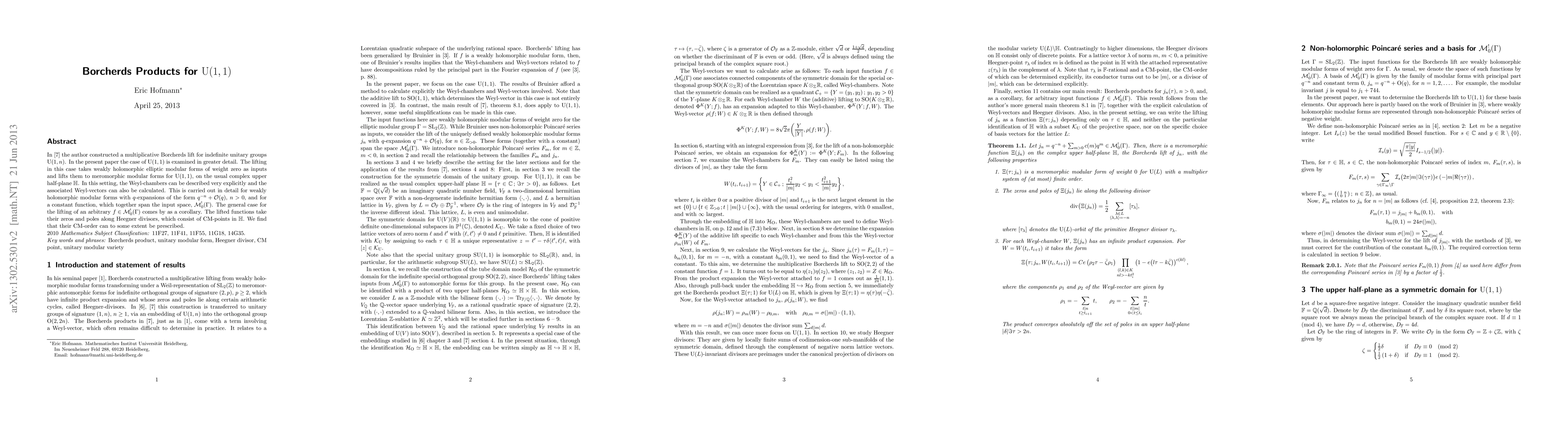 This paper details the Borcherds lift for the group U(1,1), using weakly holomorphic modular forms of weight zero to generate meromorphic modular forms. It provides explicit calculations of Weyl-chambers and Weyl-vectors, and determines the Heegner divisors consisting of CM-points.