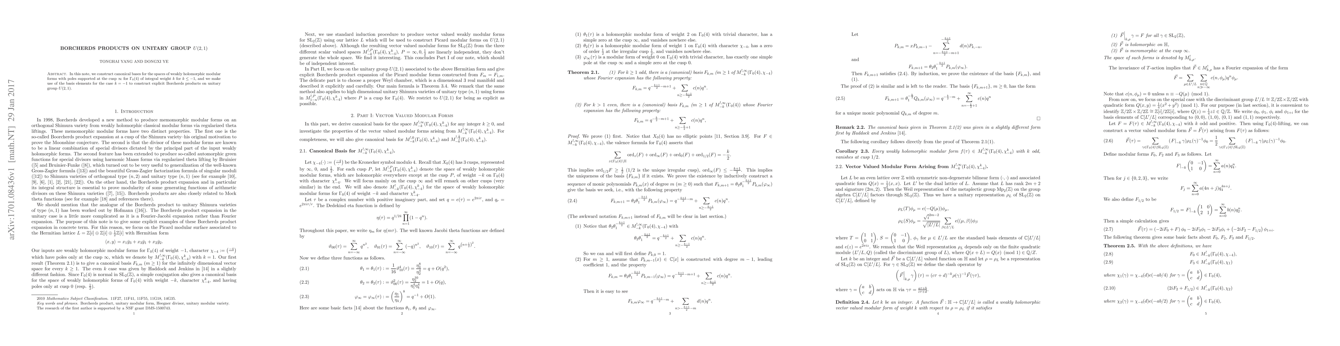 This paper constructs canonical bases for modular forms for $\Gamma_{0}(4)$ and uses these to explicitly construct Borcherds products on the unitary group $U(2,1)$, focusing on integral weights $k\leq-1$.