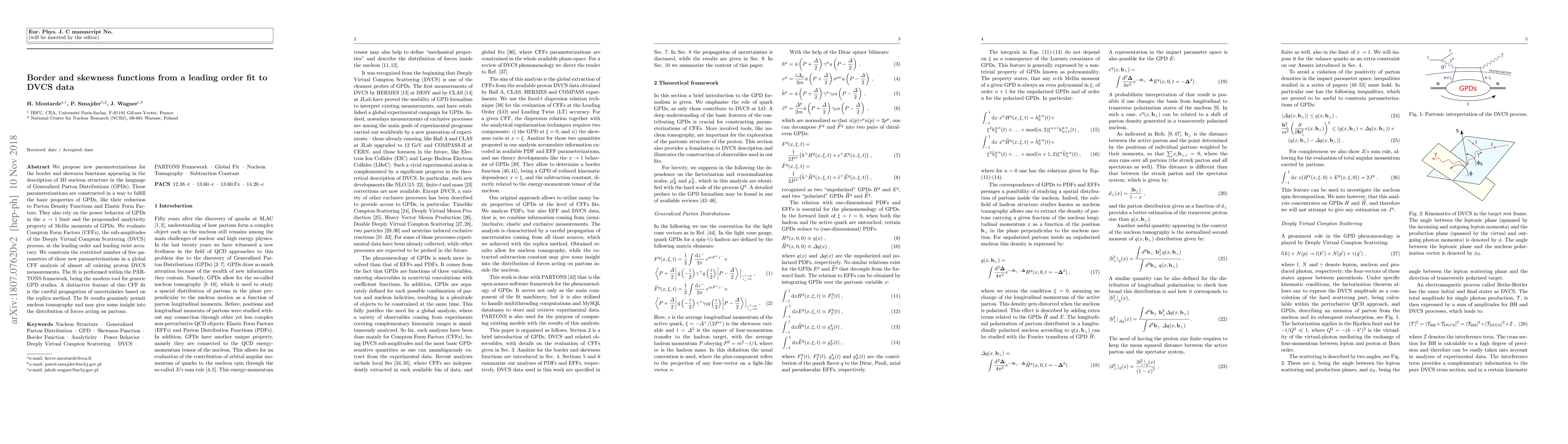 We propose new parameterizations for the border and skewness functions appearing in the description of 3D nucleon structure in the language of Generalized Parton Distributions (GPDs). These parameterizations are constructed in a way to fulfill the basic properties of GPDs, like their reduction to Parton Density Functions and Elastic Form Factors. They also rely on the power behavior of GPDs in the $x \to 1$ limit and the propounded analyticity property of Mellin moments of GPDs. We evaluate Compton Form Factors (CFFs), the sub-amplitudes of the Deeply Virtual Compton Scattering (DVCS) process, at the leading order and leading twist accuracy. We constrain the restricted number of free parameters of these new parameterizations in a global CFF analysis of almost all existing proton DVCS measurements. The fit is performed within the PARTONS framework, being the modern tool for generic GPD studies. A distinctive feature of this CFF fit is the careful propagation of uncertainties based on the replica method. The fit results genuinely permit nucleon tomography and may give some insight into the distribution of forces acting on partons.