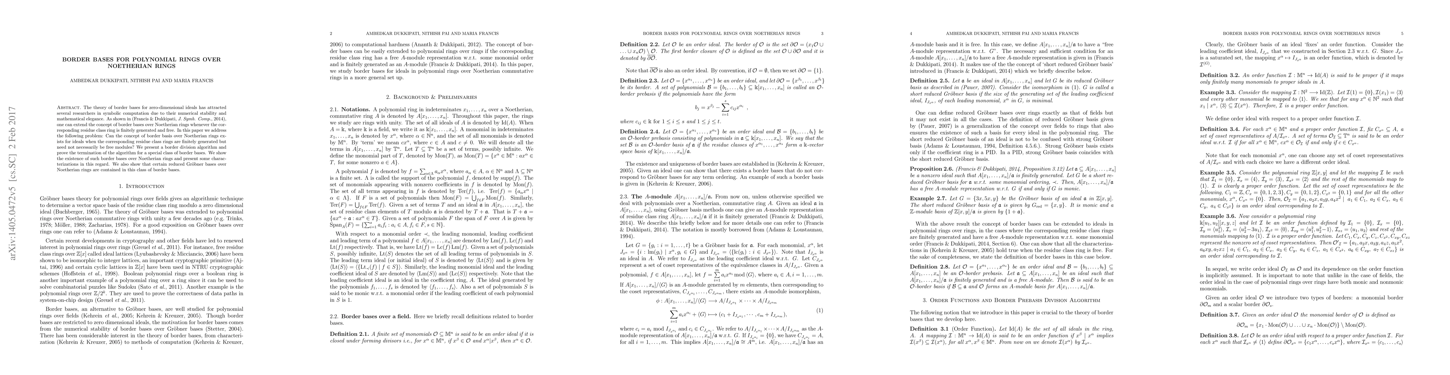 This paper explores the extension of border bases to polynomial rings over Noetherian rings, where the residue class rings are finitely generated but not necessarily free. It introduces a border division algorithm, proves its termination, and demonstrates the existence of these border bases, showing that certain reduced Gröbner bases are included.