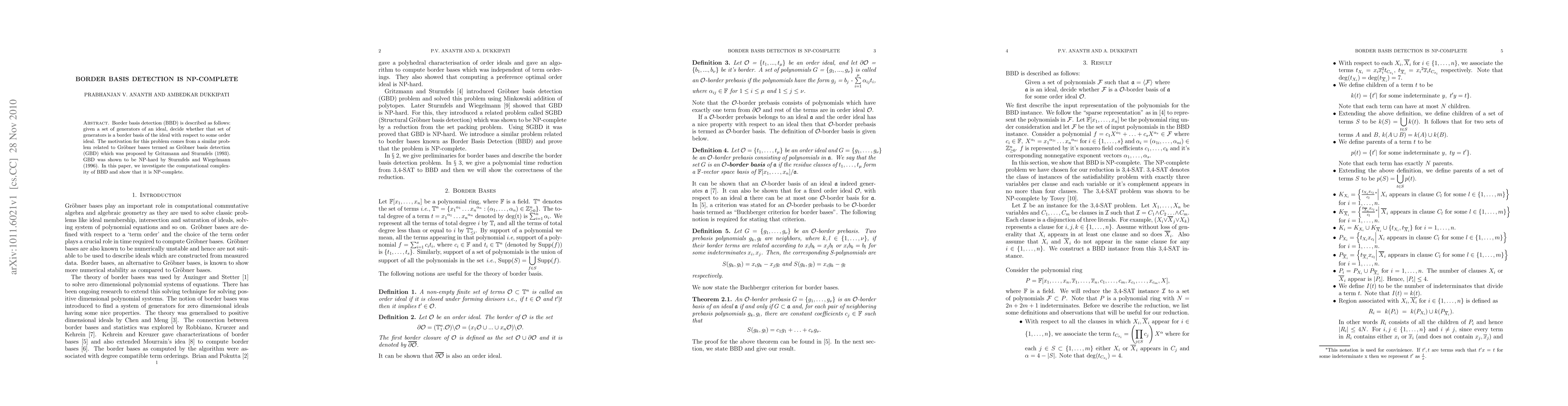 Border basis detection is a problem in algebraic geometry that has been proven to be NP-complete, meaning it cannot be solved quickly by computers for large inputs.