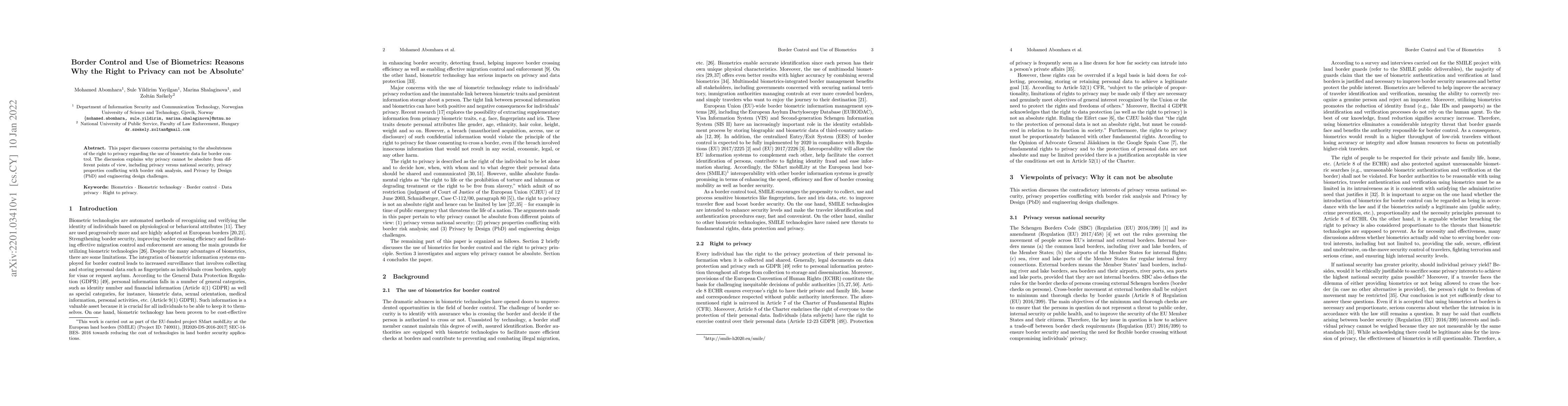 This paper explores the limitations of the absolute right to privacy in the context of biometric data use for border control, arguing that privacy must be balanced against national security and border risk analysis, while also addressing engineering challenges in Privacy by Design.