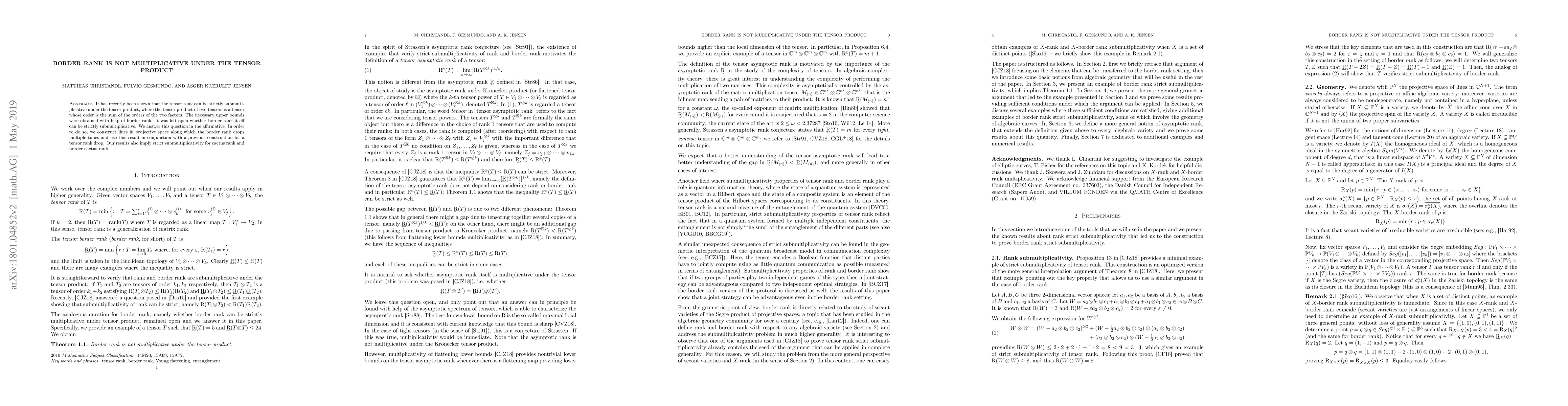 The paper demonstrates that border rank does not exhibit multiplicative behavior under the tensor product, providing a construction that shows border rank can drop multiple times along specific lines in projective space. This result also implies strict submultiplicativity for cactus rank and border cactus rank.