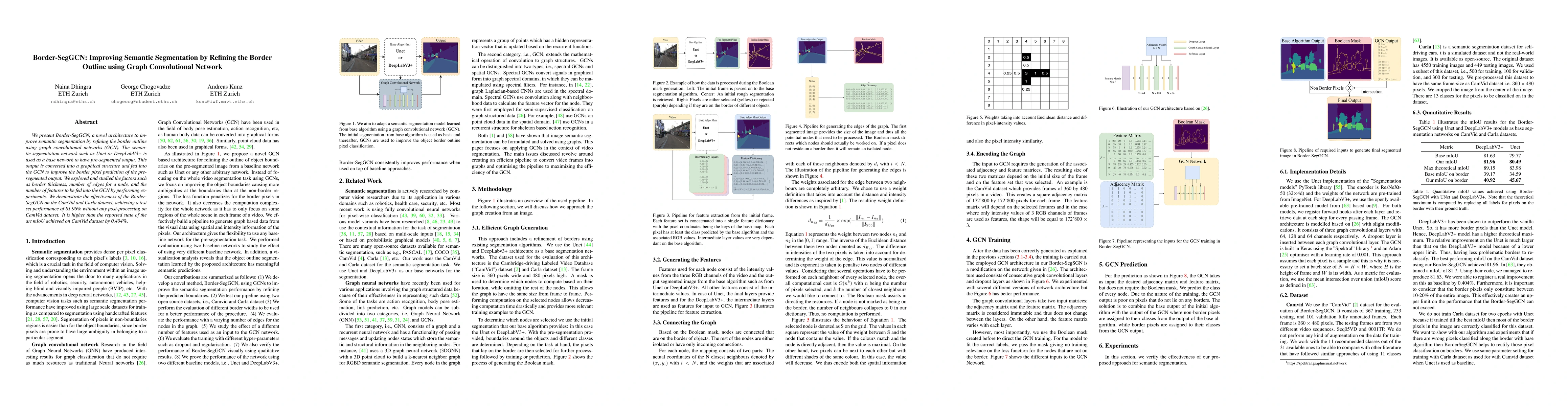 Border-SegGCN enhances semantic segmentation by refining border outlines using graph convolutional networks (GCN) on pre-segmented outputs from networks like Unet or DeepLabV3+. The method achieves superior performance on CamVid and Carla datasets, outperforming existing state-of-the-art methods by 0.404% in mIoU on CamVid.