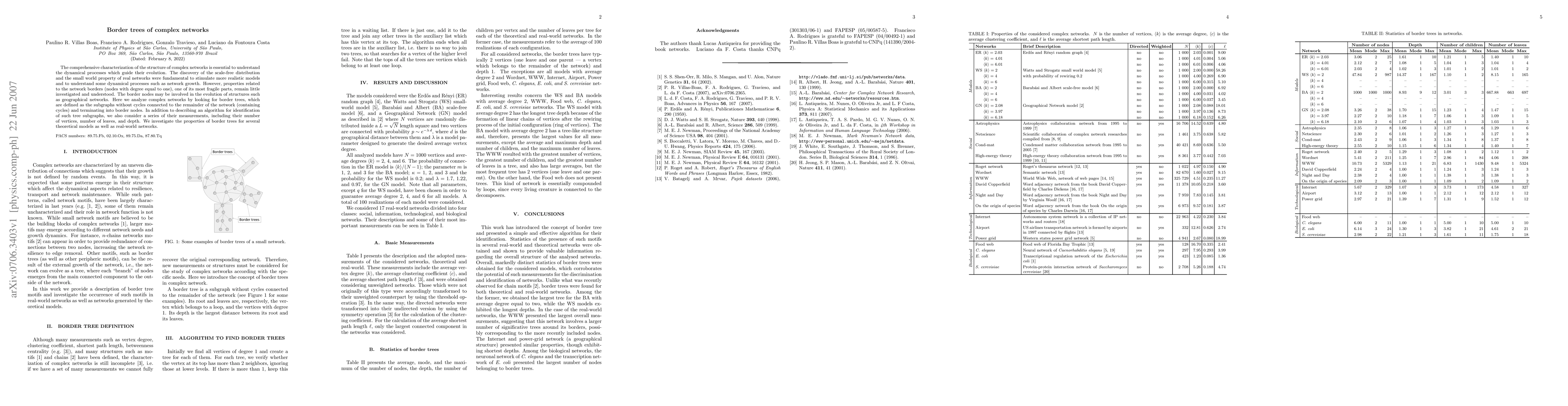 This paper investigates the properties of border trees in complex networks, which are subgraphs connected to the main network without cycles and ending at border nodes. The authors propose an algorithm to identify these structures and analyze their characteristics, including their size, leaf count, and depth, across both theoretical models and real-world networks.