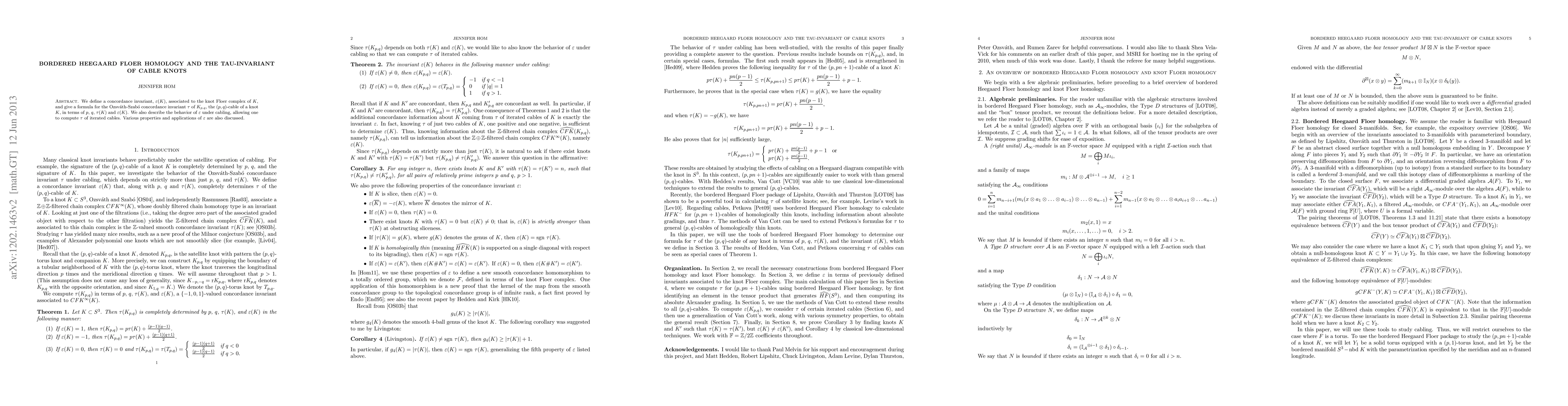 We define a concordance invariant, epsilon(K), associated to the knot Floer complex of K, and give a formula for the Ozsv\'ath-Szab\'o concordance invariant tau of K_{p,q}, the (p,q)-cable of a knot K, in terms of p, q, tau(K), and epsilon(K). We also describe the behavior of epsilon under cabling, allowing one to compute tau of iterated cables. Various properties and applications of epsilon are also discussed.