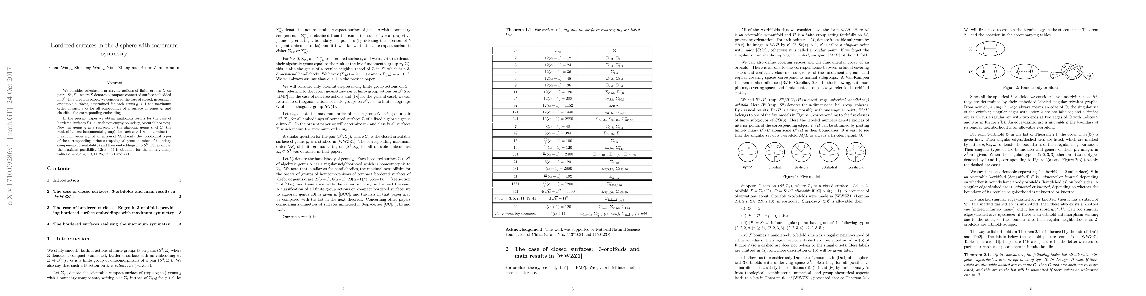 We consider orientation-preserving actions of finite groups $G$ on pairs $(S^3, \Sigma)$, where $\Sigma$ denotes a compact connected surface embedded in $S^3$. In a previous paper, we considered the case of closed, necessarily orientable surfaces, determined for each genus $g>1$ the maximum order of such a $G$ for all embeddings of a surface of genus $g$, and classified the corresponding embeddings. In the present paper we obtain analogous results for the case of bordered surfaces $\Sigma$ (i.e. with non-empty boundary, orientable or not). Now the genus $g$ gets replaced by the algebraic genus $\alpha$ of $\Sigma$ (the rank of its free fundamental group); for each $\alpha > 1$ we determine the maximum order $m_\alpha$ of an action of $G$, classify the topological types of the corresponding surfaces (topological genus, number of boundary components, orientability) and their embeddings into $S^3$. For example, the maximal possibility $12(\alpha - 1)$ is obtained for the finitely many values $\alpha = 2, 3, 4, 5, 9, 11, 25, 97, 121$ and $241$.