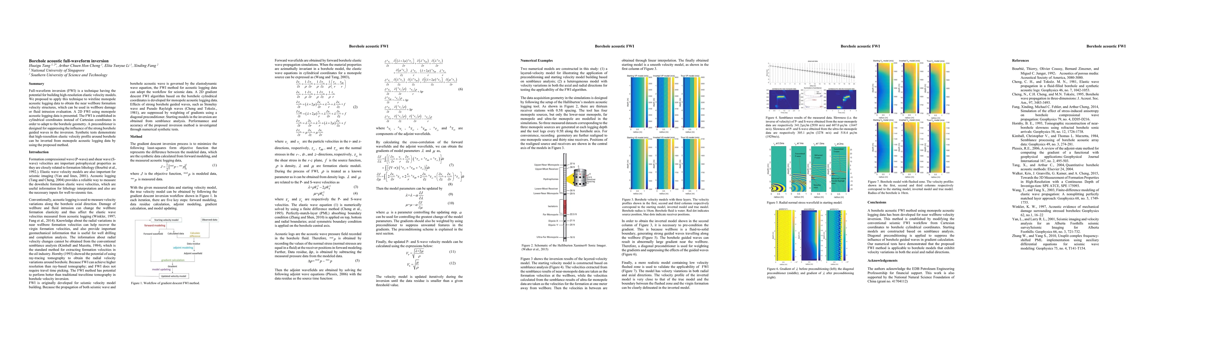 This paper proposes a 2D full-waveform inversion (FWI) technique adapted for cylindrical coordinates to process monopole acoustic logging data, aiming to build high-resolution elastic velocity models for near wellbore formation evaluation. The method includes a preconditioner to mitigate borehole guided waves and shows successful synthetic inversion results.