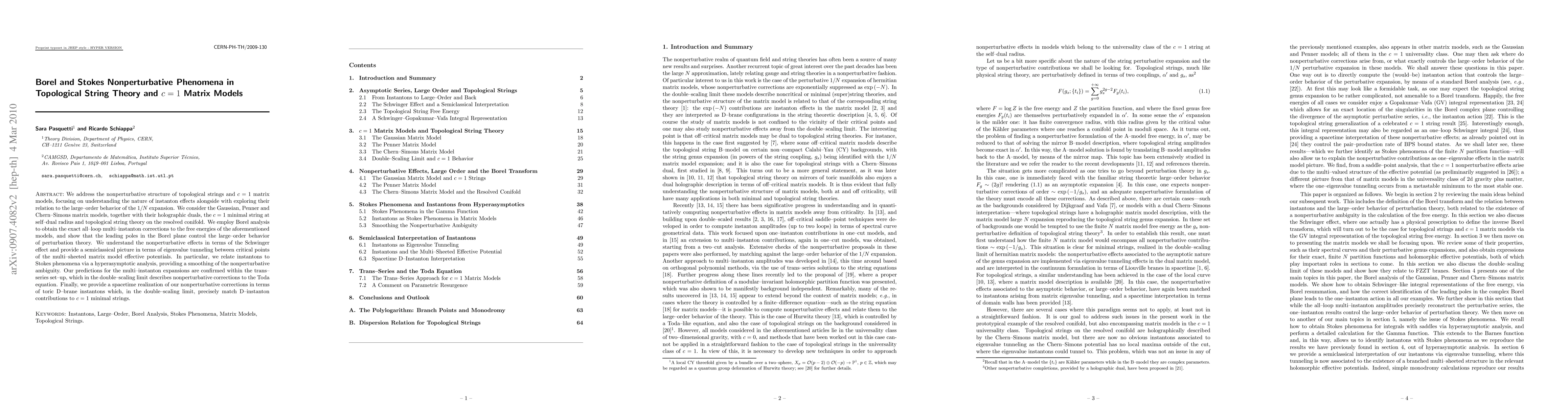 This paper explores nonperturbative phenomena in topological string theory and c=1 matrix models, utilizing Borel analysis to uncover exact multi-instanton corrections. It relates instantons to Stokes phenomena through hyperasymptotic analysis, confirming predictions in the trans-series framework and providing a spacetime realization via toric D-brane instantons.