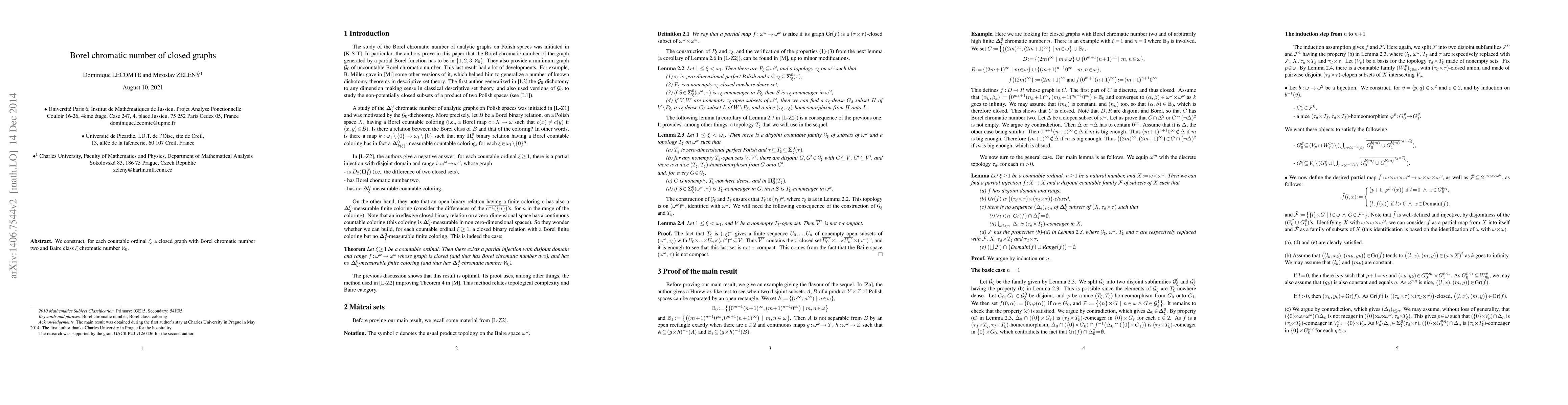 Summary: The paper constructs closed graphs for each countable ordinal $\xi$ with a Borel chromatic number of 2 and a Baire class $\xi$ chromatic number of $\aleph\_0$. This demonstrates a relationship between ordinal complexity and graph coloring properties.
