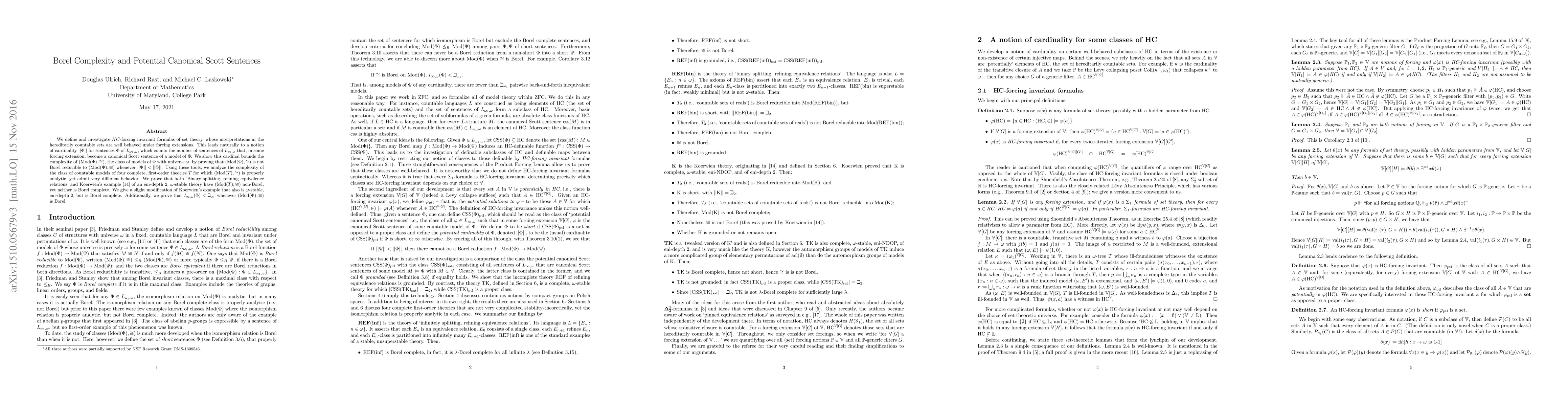 We define and investigate HC-forcing invariant formulas of set theory, whose interpretations in the hereditarily countable sets are well behaved under forcing extensions. This leads naturally to a notion of cardinality ||Phi|| for sentences Phi of $L_{\omega_1,\omega}$, which counts the number of sentences of $L_{\infty,\omega}$ that, in some forcing extension, become a canonical Scott sentence of a model of Phi. We show this cardinal bounds the complexity of (Mod(Phi), iso), the class of models of Phi with universe omega, by proving that (Mod(Phi),iso) is not Borel reducible to (Mod(Psi),iso) whenever ||Psi|| < ||Phi||. Using these tools, we analyze the complexity of the class of countable models of four complete, first-order theories T for which (Mod(T),iso) is properly analytic, yet admit very different behavior. We prove that both `Binary splitting, refining equivalence relations' and Koerwien's example of an eni-depth 2, omega-stable theory have (Mod(T),iso) non-Borel, yet neither is Borel complete. We give a slight modification of Koerwien's example that also is omega-stable, eni-depth 2, but is Borel complete. Additionally, we prove that I_{\infty,\omega}(Phi)<\beth_{\omega_1} whenever (Mod(Phi),iso) is Borel.