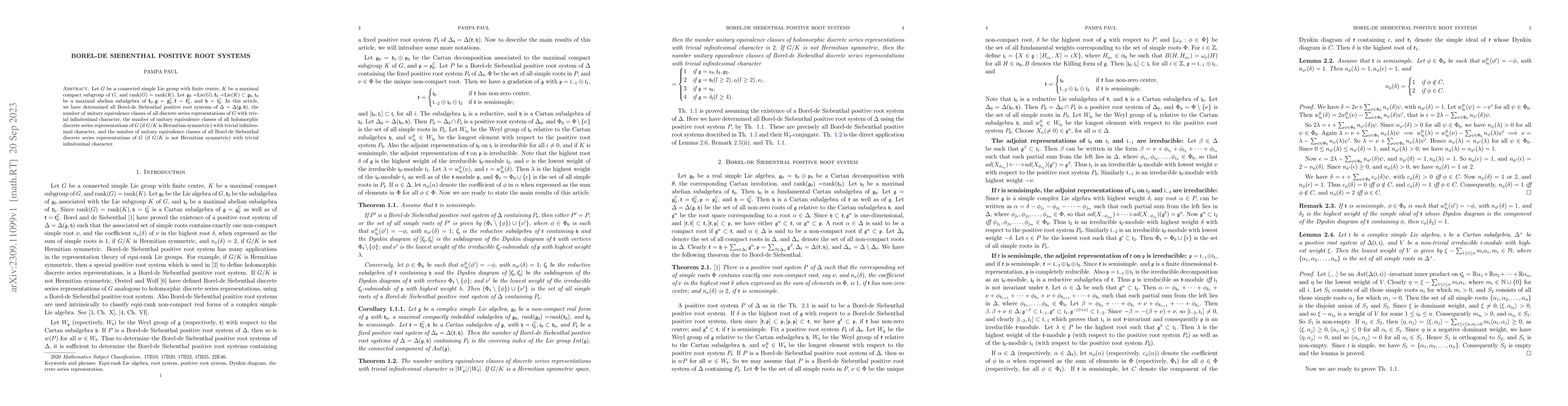 This paper determines all Borel-de Siebenthal positive root systems for a connected simple Lie group G with finite center, analyzing the unitary equivalence classes of discrete series representations with trivial infinitesimal character, including holomorphic and Borel-de Siebenthal series.