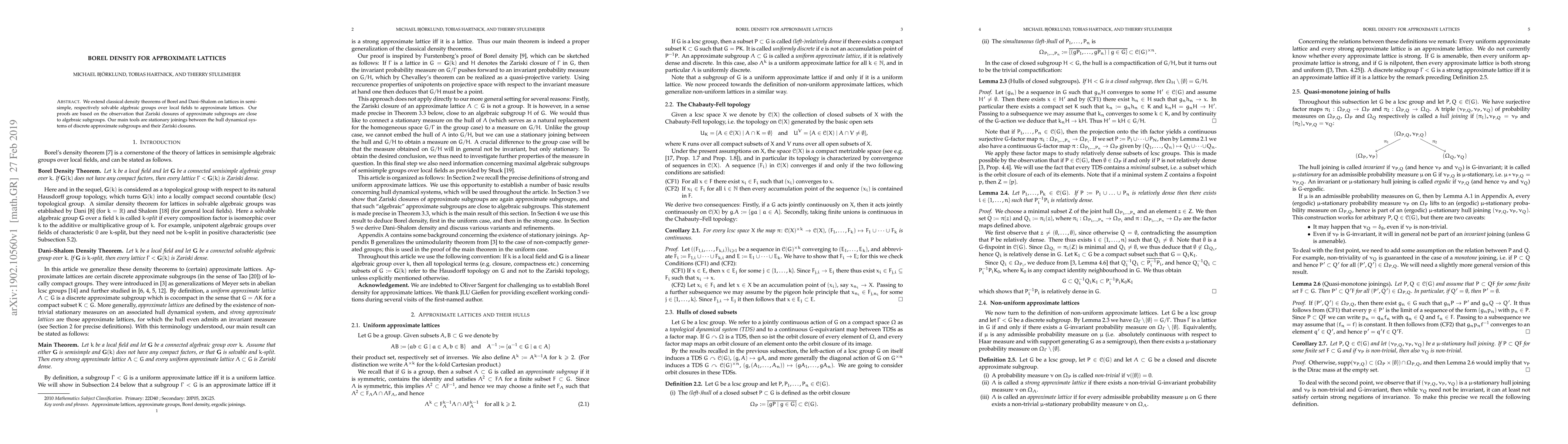 We extend classical density theorems of Borel and Dani--Shalom on lattices in semisimple, respectively solvable algebraic groups over local fields to approximate lattices. Our proofs are based on the observation that Zariski closures of approximate subgroups are close to algebraic subgroups. Our main tools are stationary joinings between the hull dynamical systems of discrete approximate subgroups and their Zariski closures.