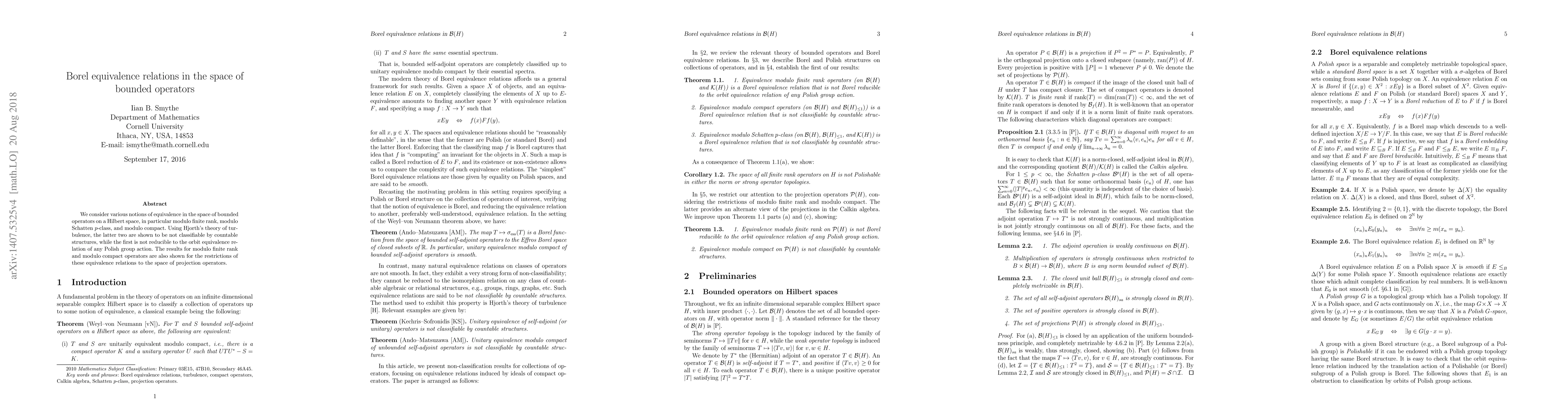 This paper explores different equivalence relations in the space of bounded operators on a Hilbert space, demonstrating that modulo Schatten $p$-class and modulo compact operators are not classifiable by countable structures, while modulo finite rank is not reducible to any Polish group action's orbit equivalence relation. The findings extend to projection operators as well.