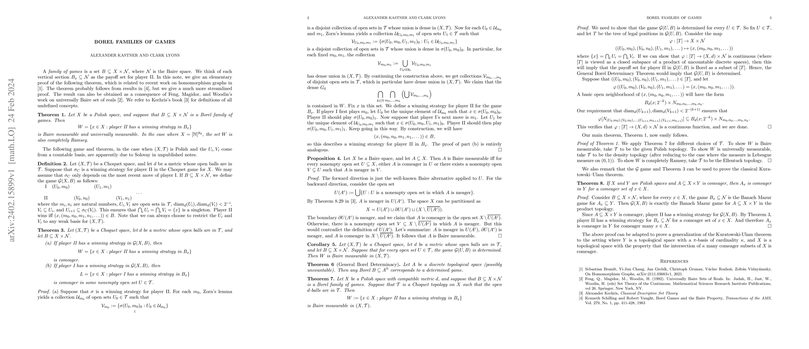 Summary: This paper provides an elementary proof demonstrating that in a Borel family of games, the set of games where player II has a winning strategy is shown to be Baire measurable, universally measurable, and completely Ramsey when the space $X = [\mathbb{N}]^{\aleph_0}$.