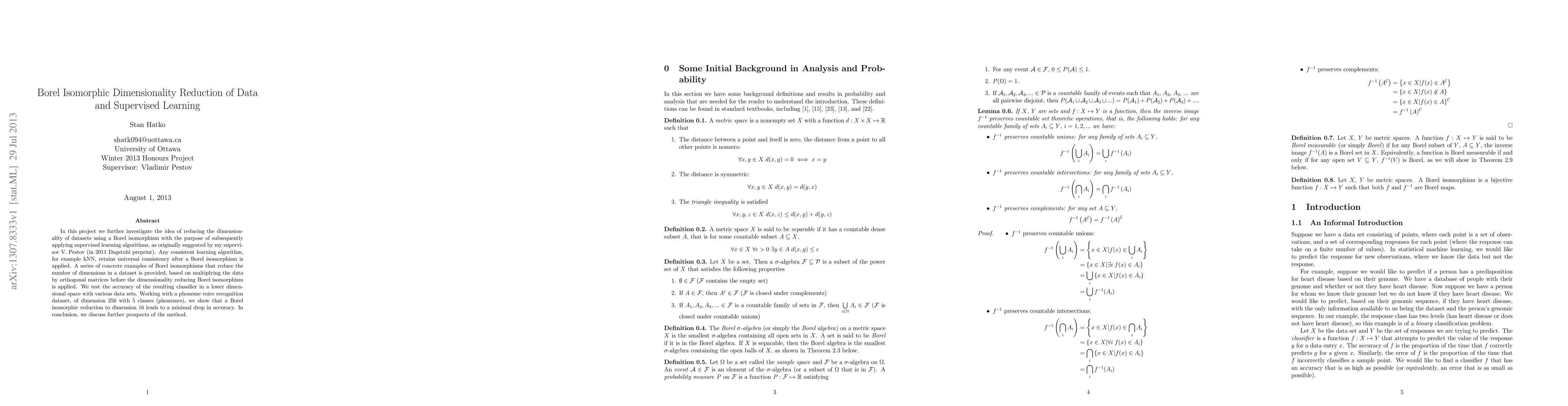 In this project we further investigate the idea of reducing the dimensionality of datasets using a Borel isomorphism with the purpose of subsequently applying supervised learning algorithms, as originally suggested by my supervisor V. Pestov (in 2011 Dagstuhl preprint). Any consistent learning algorithm, for example kNN, retains universal consistency after a Borel isomorphism is applied. A series of concrete examples of Borel isomorphisms that reduce the number of dimensions in a dataset is provided, based on multiplying the data by orthogonal matrices before the dimensionality reducing Borel isomorphism is applied. We test the accuracy of the resulting classifier in a lower dimensional space with various data sets. Working with a phoneme voice recognition dataset, of dimension 256 with 5 classes (phonemes), we show that a Borel isomorphic reduction to dimension 16 leads to a minimal drop in accuracy. In conclusion, we discuss further prospects of the method.