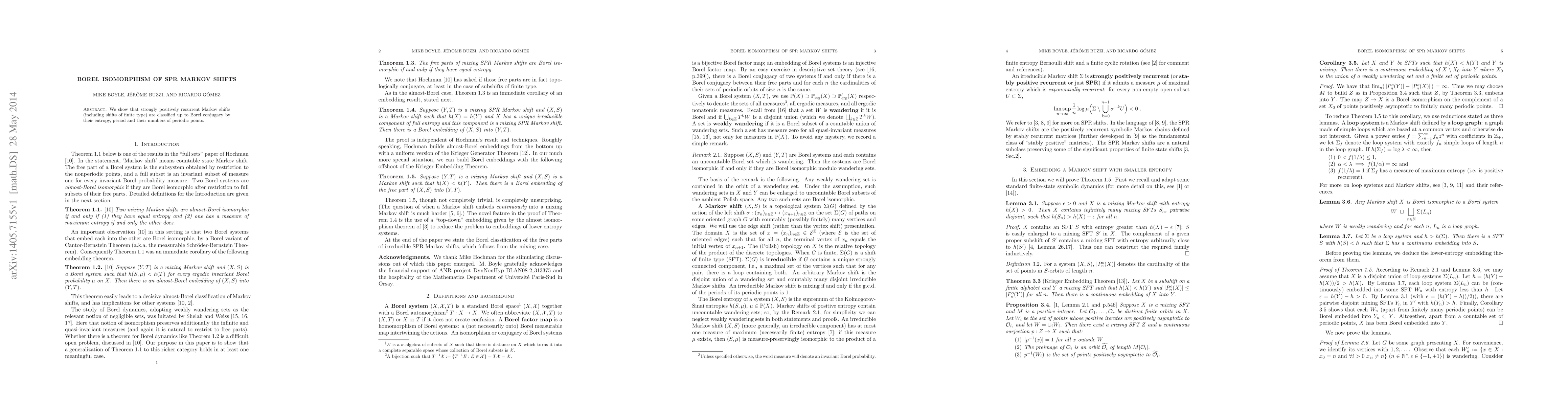 We show that strongly positively recurrent Markov shifts (in particular shifts of finite type) are classified up to Borel conjugacy by their entropy, period and their numbers of periodic points.